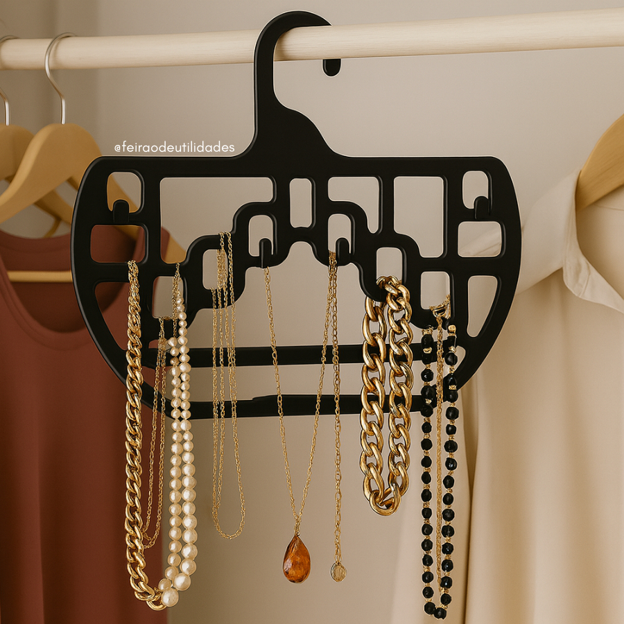 --------------------------------------------------------------------------------------------------- PRODUTO NOVO - PRONTA ENTREGA - ENVIO IMEDIATO --------------------------------------------------------------------------------------------------- Nosso Cabide Organizador Multiuso com 10 Ganchos é perfeito para manter seus acessórios sempre à vista, organizados e sem bagunça. Com design moderno, acabamento fosco e base reta, ele traz funcionalidade sem abrir mão do estilo. - 10 ganchos versáteis: pendure colares, pulseiras, brincos, cintos, lenços, tiaras e mais - Design inteligente: formato compacto que otimiza o espaço do seu guarda-roupa - Gancho resistente: suporta o peso dos acessórios com segurança - Material durável: plástico super resistente - Ideal para quartos, closets e lojas: organização com visual clean e sofisticado - Cor: Preto - Medidas: 27 x 30 cm Chega de acessórios perdidos e nós indesejados! Com esse organizador, tudo fica no lugar certo, sem esforço. Ele é o toque de praticidade que faltava na sua rotina. 💬 Ficou com alguma dúvida? Converse com nosso time através do atendimento pelo chat!