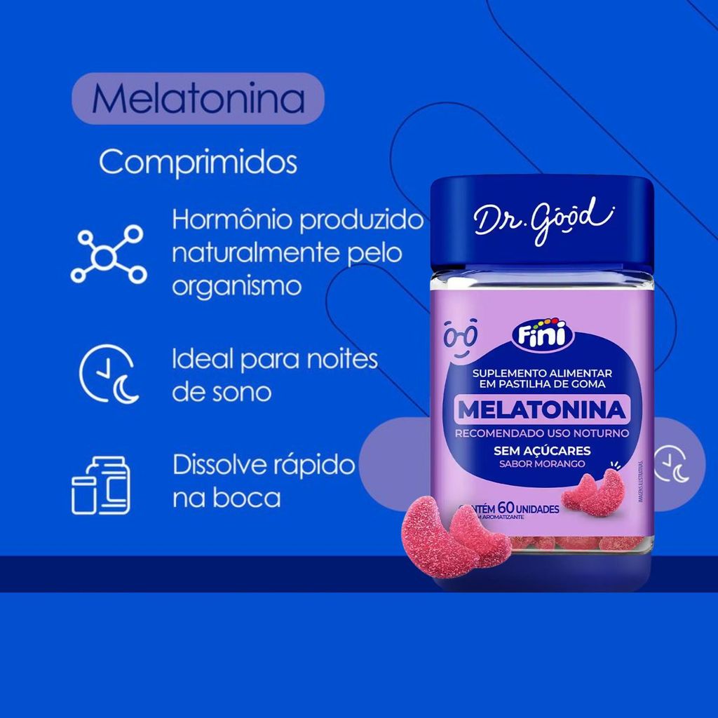 Dr Good apresenta sua dose diária de suplementação unindo sabor, qualidade e praticidade. A Melatonina é um suplemento alimentar em goma sabor morango, baixo em valor energético, sem açúcares e sem lactose. Recomendação de uso: Uso recomendado para adultos (Maiores de 19 anos): Consumir 1 unidade ao dia DE UMA ÚNICA VEZ RECOMENDADO USO NOTURNO. ESTE PRODUTO NÃO É UM MEDICAMENTO. NÃO EXCEDER A RECOMENDAÇÃO DIÁRIA DE CONSUMO INDICADA NA EMBALAGEM. MANTENHA FORA DO ALCANCE DE CRIANÇAS. Este produto não deve ser consumido por gestantes, lactantes, crianças e pessoas envolvidas em atividades que requerem atenção constante. Pessoas com enfermidades e/ou sob o uso de medicamentos, consulte seu médico.