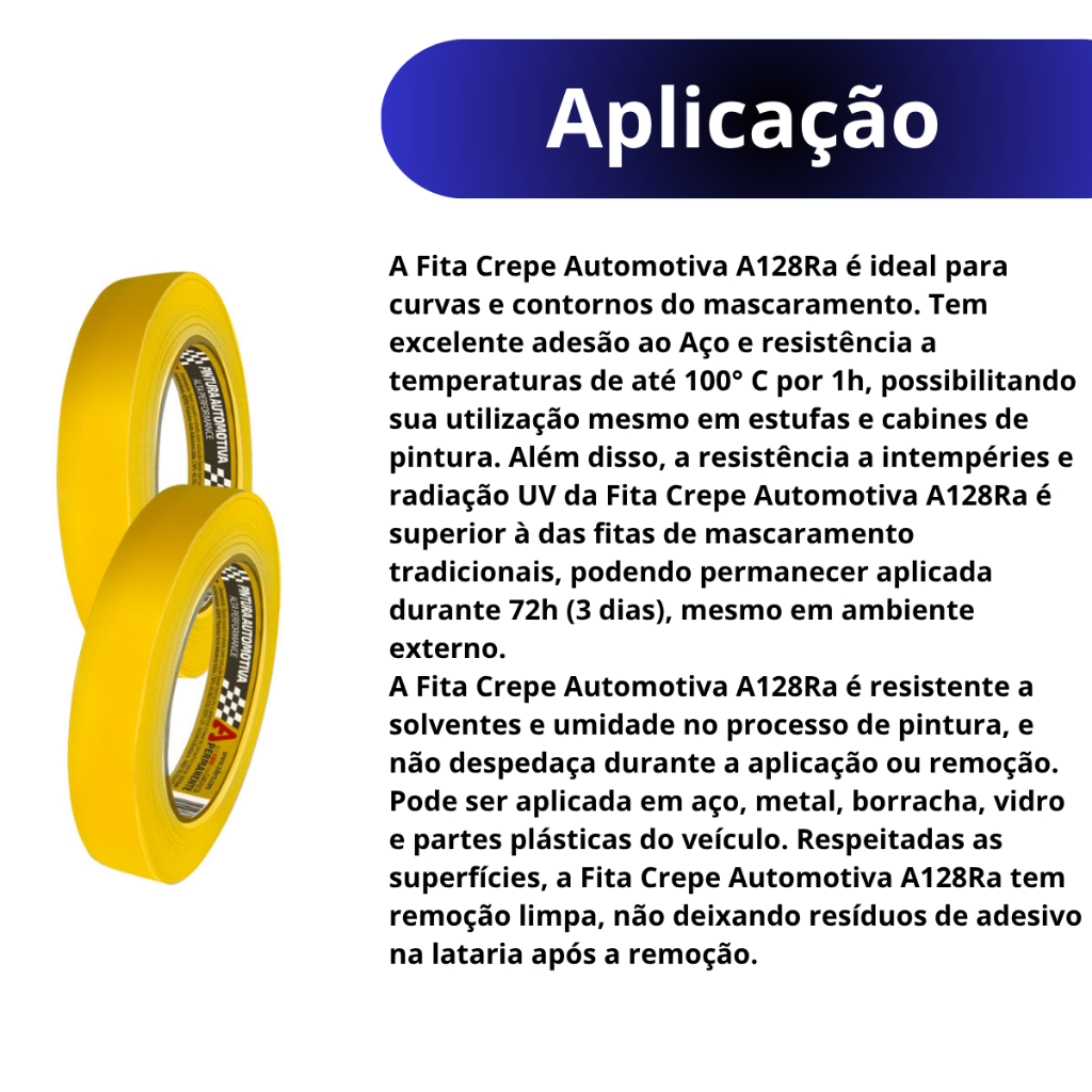 kit 3 Unidades Fita Crepe Automotiva A128RA PRODUTO ORIGINAL COM NOTA FISCAL A Fita Crepe Automotiva A128Ra é apresentada na cor amarela, tem alta performance e foi especialmente desenvolvida para profissionais, contendo componentes que favorecem a aplicação não só para mascaramento automotivo, mas para todas as etapas de funilaria e pintura, sendo a Fita Crepe mais indicada até mesmo em centros de estética automotiva. Aplicação A Fita Crepe Automotiva A128Ra é ideal para curvas e contornos do mascaramento. Tem excelente adesão ao Aço e resistência a temperaturas de até 100° C por 1h, possibilitando sua utilização mesmo em estufas e cabines de pintura. Além disso, a resistência a intempéries e radiação UV da Fita Crepe Automotiva A128Ra é superior à das fitas de mascaramento tradicionais, podendo permanecer aplicada durante 72h (3 dias), mesmo em ambiente externo. A Fita Crepe Automotiva A128Ra é resistente a solventes e umidade no processo de pintura, e não despedaça durante a aplicação ou remoção. Pode ser aplicada em aço, metal, borracha, vidro e partes plásticas do veículo. Respeitadas as superfícies, a Fita Crepe Automotiva A128Ra tem remoção limpa, não deixando resíduos de adesivo na lataria após a remoção. Resumo dos Atributos - Fita Crepe Automotiva A128Ra: • Cor Amarela, para melhor visibilidade após aplicada • Alta Performance • Evita retrabalhos • Excelente adesão ao Aço • Resiste a até 100° C por 1h • Resiste até 3 dias em ambiente externo • Remoção Limpa, sem deixar resíduo na lataria • Resistência a UV • Resistência a solventes e umidade • Remoção em até 72h se exposta ao Sol • Indicada para Funilaria e Pintura • Excelente desempenho em curvas e contornos do mascaramento automotivo ADERE Nossa trajetória começou em 1967 com a missão de fazer a diferença na vida das pessoas e das indústrias, através de soluções que aderem. Com muito trabalho, dedicação e amor pela nosso missão, avançamos e crescemos gradualmente nos quesitos equipe, estrutura, tecnologia e portfólio de produtos. Hoje, somos uma marca estabelecido no mercado, sendo referência nacional e internacional. Conectamos dezenas de linhas de produtos e centenas de itens em portfólio aos nossos clientes e consumidores, entregamos em mais de 10 países, distribuídos em 5 continentes. Nos orgulhamos muito da estrada percorrida até aqui, os prêmios conquistados reafirmam que estamos no caminho certo, assim como as nossas certificações ISO 9001, ISO 14001e o selo FSC®. que afirmam o nosso compromisso e consciência ambiental. Estamos presentes também no dia a dia das pessoas, nas casas, nos escritórios, na construção civil e também na indústria. Com mais 43 famílias de produtos e mais de 1.000 itens em comercialização, que atendem a diversos mercados como: