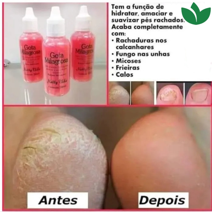 Gota Milagrosa 30mL Acaba completamente com as rachaduras dos pés e mãos, eliminando a camada grossa, deixando sua pele macia e aveludada.. Loção Gota Milagrosa tem a função de hidratar amaciar e suavizar os pés ásperos. Elimina calos, rachaduras nos calcanhares, cravos e asperezas dos pés e mãos, rachaduras nos dedos. Composição- Álcool estearílico, Glicerina, Óleo Mineral, Cetrimonium Cloride, Uréia, Ácido Cítrico. Modo de usar: Use todas as noites e diga adeus aos calos, rachaduras e asperezas e do ressecamentos dos seus pés.