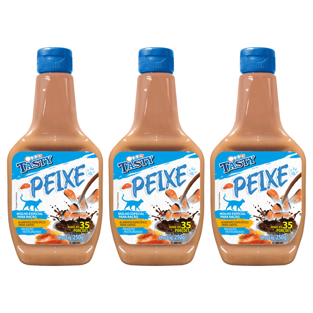 Kit com 3 Molhos para Gato Doogs Tasty – 250g cada | Sabor Carne, Frango, Peixe ou Misto | Rende até 105 Porções! Mais sabor, mais saúde e mais amor na hora da refeição do seu gatinho! Transforme o momento da alimentação do seu pet em uma explosão de sabor com o Kit de 3 Molhos para Gatos Doogs Tasty! São 3 unidades de 250g cada, com opções para agradar todos os paladares felinos: Carne, Frango, Peixe ou Misto (1 de cada sabor). Cada embalagem rende até 35 porções, totalizando até 105 porções por kit! Ideal para gatos que perderam o apetite ou que merecem uma ração mais gostosa e atrativa. Variações Disponíveis: Kit 3x Carne – Clássico, saboroso e cheio de aroma. Kit 3x Frango – Leve, nutritivo e fácil de agradar. Kit 3x Peixe – Irresistível para os felinos mais exigentes. Kit Misto (1x Carne, 1x Frango, 1x Peixe) – Perfeito para testar e descobrir o favorito do seu pet. Benefícios do Molho Doogs Tasty: Estimula o apetite – Ideal para gatos seletivos ou que enjoaram da ração seca. Rico em sabor, leve na fórmula – Desenvolvido para manter a alimentação saudável e balanceada. Fácil digestão – Formulado especialmente para o sistema digestivo dos felinos. Para todas as idades e portes – Desde filhotes até gatos idosos. Sem ingredientes prejudiciais – Seguro para o consumo diário. O que vem no kit: 3 embalagens de Molho para Ração Doogs Tasty de 250g cada. Escolha sua combinação favorita: Carne, Frango, Peixe ou Misto. Modo de Uso: Agite bem antes de usar. Adicione 1 colher de sopa (7ml) para cada 100g de ração seca. Misture bem e sirva ao seu gatinho. Pode ser usado diariamente. Informações Técnicas: Produto: Molho para Ração Saborizado Marca: Doogs Quantidade por unidade: 250g Porções por embalagem: Até 35 porções Total no kit: Até 105 porções Animal: Gatos Porte: Todos os portes Idade: Todas as fases da vida Validade: Vide embalagem Armazenamento: Conservar em local fresco e seco Garanta agora o Kit com 3 Molhos Doogs Tasty e transforme cada refeição do seu pet em um momento irresistível de carinho e sabor! molho para gatos sabor carne, molho para ração de gato, molho para ração seca de gato, molho para gatos exigentes, molho estimulador de apetite para gato, kit molho para gato 3 unidades, molho Doogs Tasty gato, molho para gato sabor frango, molho para gato sabor peixe, molho para gato misto 3 sabores