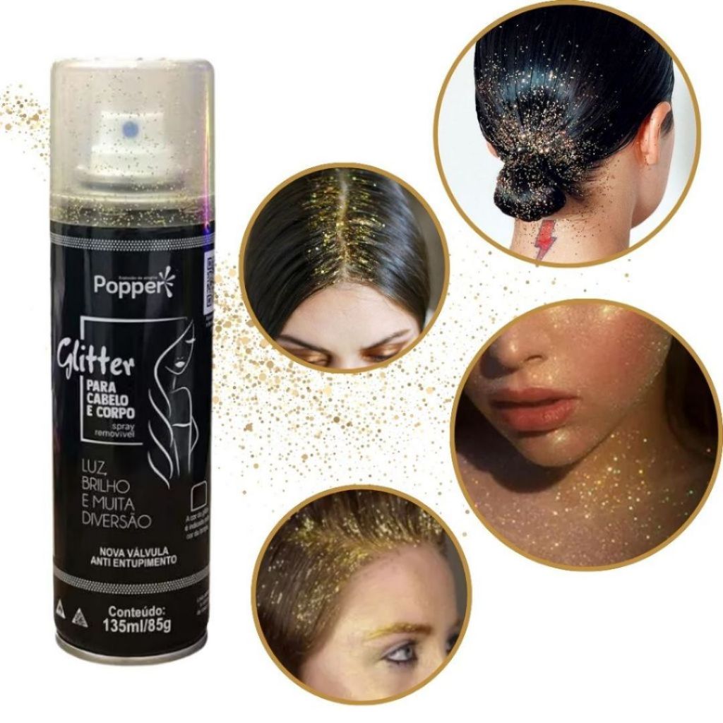 | Kit 3 unidades: Spray Glitter Dourado Para Cabelo Roupa e Corpo Pop... este produto | R$ 53,99 | 53% | 5.0/5 | — |