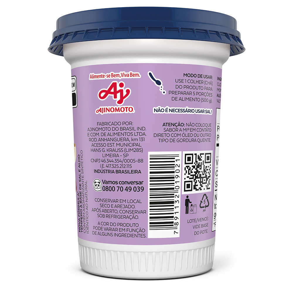 Sabor A Mi® Alho e Sal é um tempero completo à base de alho natural e sal, foi desenvolvido para trazer mais sabor e praticidade às receitas do dia a dia. O produto dispensa o uso de sal adicional e não contém conservantes, permite temperar os pratos na quantidade ideal, garantindo sabor consistente e controle no preparo. Utilização: - 1 colher de chá (5 g) tempera até 500 g de alimento; - Substitui o sal comum diretamente nas receitas; - Pode ser aplicado diretamente em carnes, legumes, marinadas, sopas, molhos e arroz; - Ideal para uso em alimentos crus ou durante o preparo térmico. Condições de armazenamento Manter em local seco, arejado e ao abrigo da luz. Após aberto, manter a embalagem bem fechada.