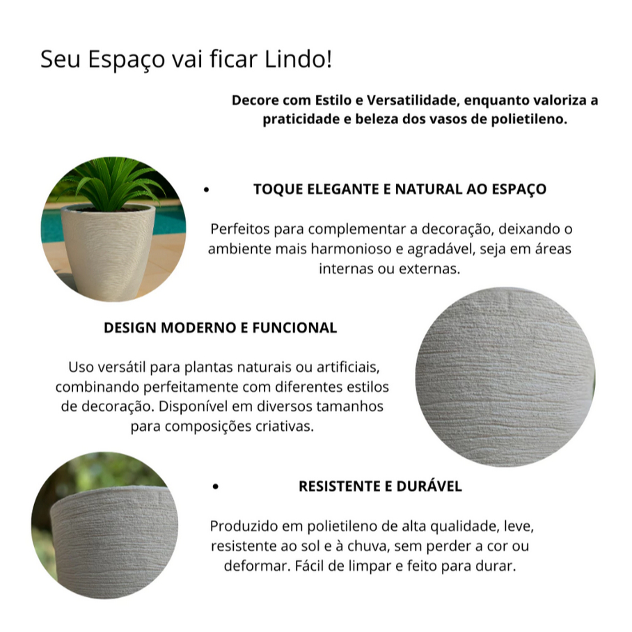 Kit 3 Vasos Coluna Redonda Escovado 1,2 e Bacia Escovada 1 ENVIO IMEDIATO!!! Dimensões Coluna Redonda N1: - Altura: 28 cm - Largura (boca): 23 cm - Fundo: 16 cm Dimensões Coluna Redonda N2: - Altura: 38 cm - Largura (boca): 29 cm - Fundo: 19 cm Dimensões Bacia Escovada 1: - Altura: 13 cm Largura (boca): 26 cm Fundo: 15cm Por que escolher nossos vasos? ✅ Design elegante e acabamento impecável ✅ Podem ser usados em áreas internas e externas ✅ Feitos em polietileno resistente, suportam sol, chuva e impactos ✅ Leves, fáceis de transportar e não desbotam ✅ Resistentes a umidade, maresia e não proliferam fungos e bactérias ✅ Mantêm a sofisticação da cerâmica, mas com mais resistência e praticidade ⚠️ Atenção: As cores podem apresentar pequenas variações. Plantas e flores das imagens são ilustrativas.