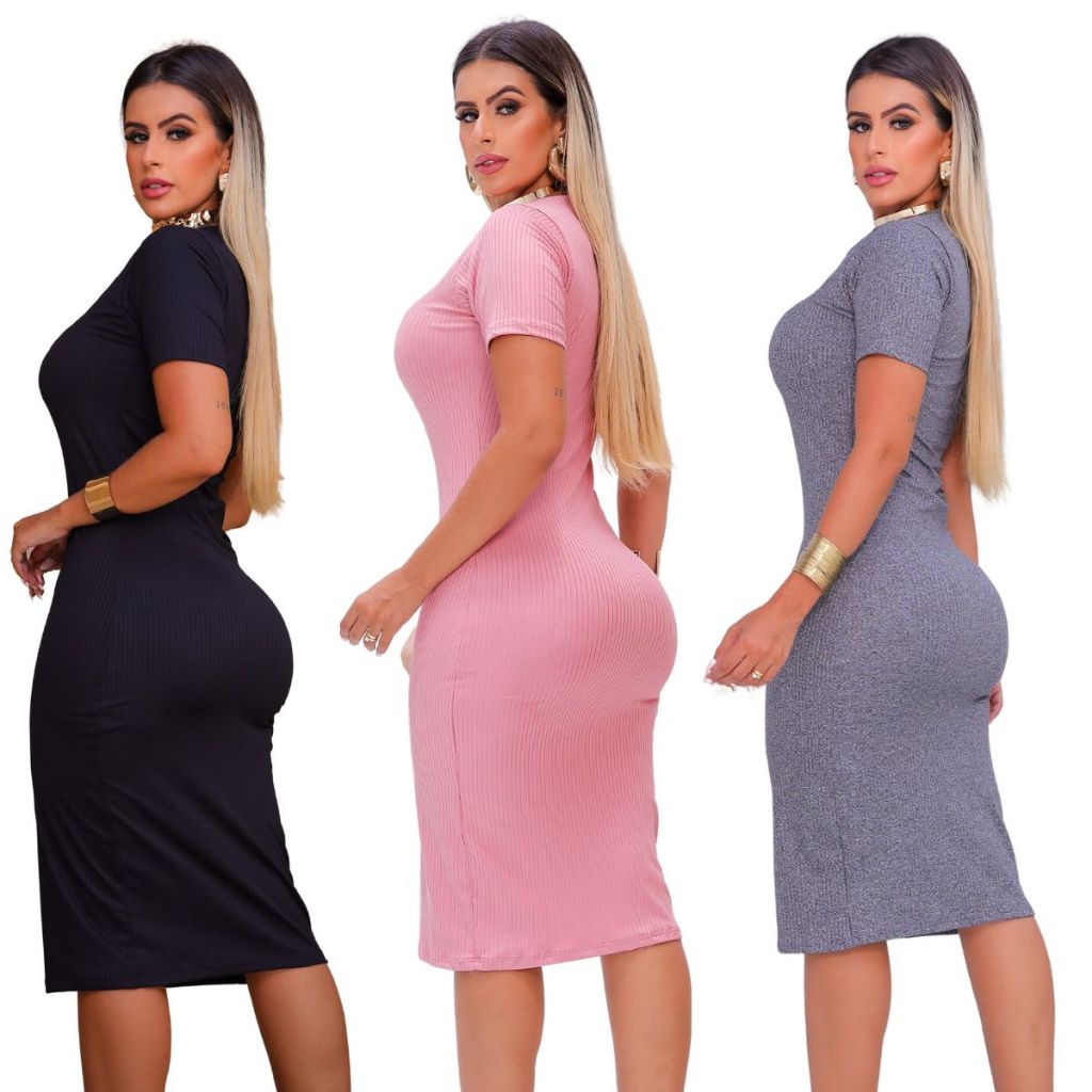 Kit 3 Vestidos Canelado Tubinho Moda Verão Social Atacado