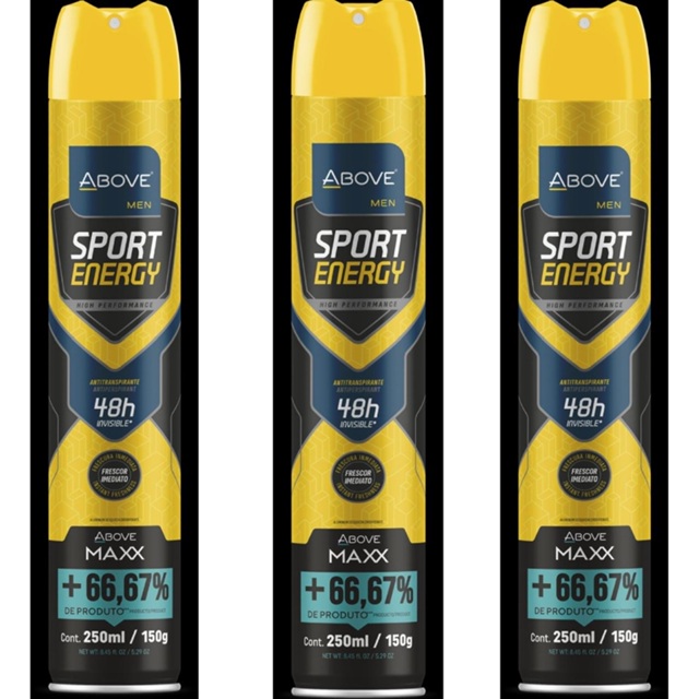 Kit 3x Desodorante Above Maxx Sport Energy Men Aerossol 250ml Gigante Proteção de Alta Performance para o Homem Ativo Garanta o seu estoque com o Kit Econômico do Desodorante Antitranspirante mais procurado da linha Masculina da Above! O Maxx Sport Energy foi desenvolvido para homens que buscam alta performance e proteção extrema durante a rotina intensa de esportes e trabalho. O Que Você Receberá (Conteúdo do Kit) • 03 unidades do Desodorante Above Maxx Sport Energy Men Aerossol • Volume: 250ml (Cada) • Gênero: Masculino • Formato: Aerossol Antitranspirante Destaques e Benefícios do Produto • 48 Horas de Proteção: Fórmula de alta performance que garante proteção eficaz contra o suor e o mau odor por até 48 horas. • Tamanho Maxx (250ml): Embalagem gigante que oferece mais produto, proporcionando um excelente custo-benefício e durabilidade. • Frescor Imediato: Sensação refrescante instantânea após a aplicação, ideal para começar o dia ou após exercícios. • High Performance: Perfeito para quem pratica esportes ou tem atividades que exigem alto desempenho físico. • Fórmula sem Álcool: Dermatologicamente testado e livre de álcool, minimizando o risco de irritações na pele. • Fragrância Envolvente: Floral amadeirada, que oferece uma sensação de energia e bem-estar o dia todo. Características Técnicas • Marca: Above • Linha: Maxx Sport Energy Men • Tipo: Desodorante Antitranspirante Aerossol • Proteção: 48 horas • Livre de: Álcool e Triclosan • Modo de Usar: Agite bem a embalagem e aplique nas axilas a uma distância aproximada de 15 cm. Vantagem do Kit (Custo-Benefício Inteligente) Comprar o kit com 3 unidades garante o menor preço unitário do produto, além de economizar no frete e garantir que você terá seu desodorante favorito por muito mais tempo. Economia e Praticidade na sua rotina!