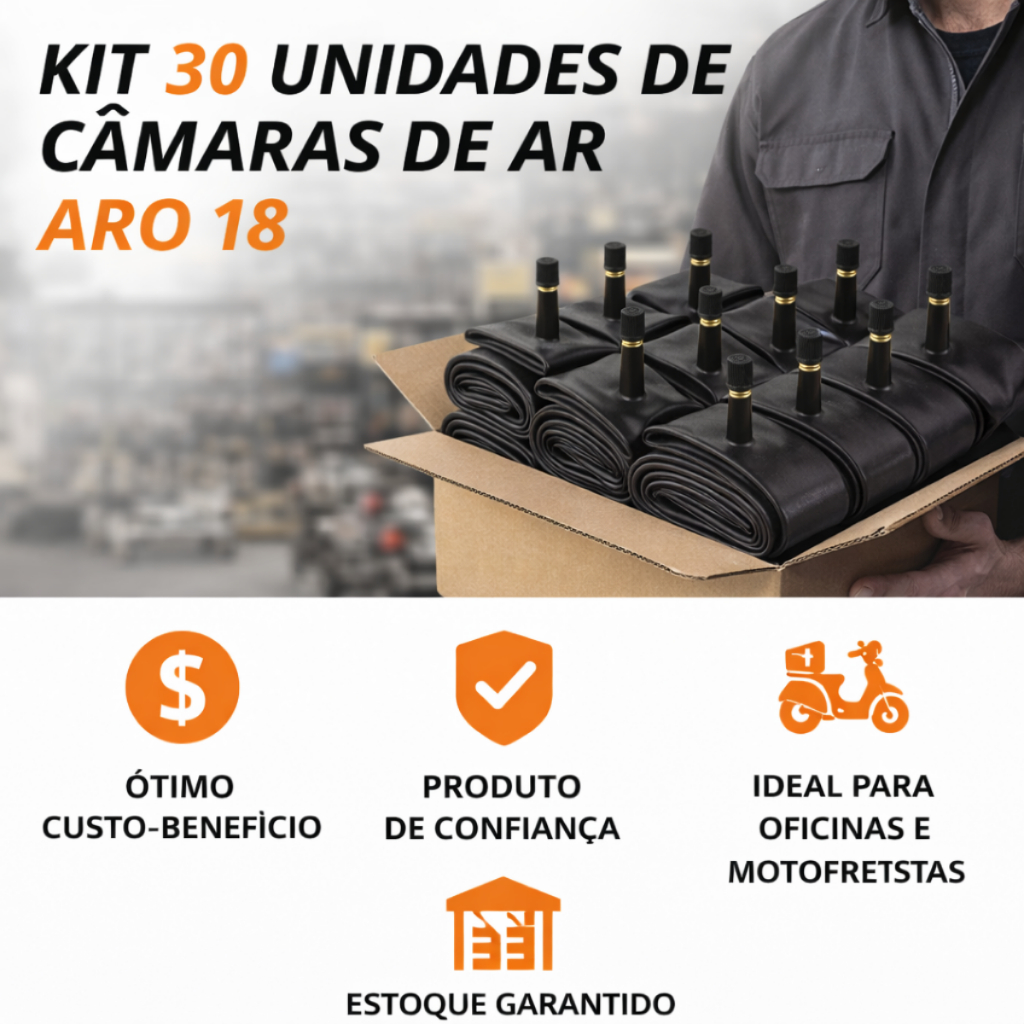 KIT 30 CÂMARAS DE AR PARA MOTO – ALTA RESISTÊNCIA | MOVE GIRO O Kit com 30 Câmaras de Ar para Moto Move Giro é a escolha ideal para lojistas, oficinas, borracharias, frotistas e vendedores de marketplace que buscam estoque confiável, padrão profissional e excelente custo-benefício. Fabricadas em borracha de alta qualidade, as câmaras oferecem vedação eficiente, flexibilidade e resistência, garantindo ótimo desempenho em pneus de motocicletas que utilizam câmara de ar, mesmo em uso intenso no dia a dia. ✅ PRINCIPAIS VANTAGENS ✔️ Kit com 30 unidades – ideal para revenda e reposição ✔️ Compatível com pneus de motocicletas com câmara ✔️ Borracha resistente e durável ✔️ Encaixe correto no aro, sem necessidade de adaptação ✔️ Produto novo, pronta entrega ✔️ Excelente custo por unidade ESPECIFICAÇÕES TÉCNICAS Produto: Câmara de Ar para Moto Marca: Move Giro Quantidade: 30 unidades Material: Borracha Tipo: Câmara de ar convencional Formato de venda: Kit Condição: Novo Aplicação: Pneus de motocicletas com câmara Verifique o ARO e a medida do pneu antes da compra para garantir compatibilidade. INDICAÇÃO DE USO Indicado para oficinas mecânicas, borracharias, motoboys, frotas, revendedores e lojistas, além de motociclistas que desejam manter estoque para manutenção e reposição rápida. 📦 CONTEÚDO DA EMBALAGEM 30x Câmaras de Ar ⚠️ OBSERVAÇÕES IMPORTANTES Produto destinado a pneus de moto que utilizam câmara de ar Instalação recomendada por profissional especializado Imagens meramente ilustrativas em caso de dúvidas, utilize o campo de perguntas antes da compra Move Giro – especialista em peças e acessórios para motocicletas Mais estoque, mais margem e mais vendas 🚀