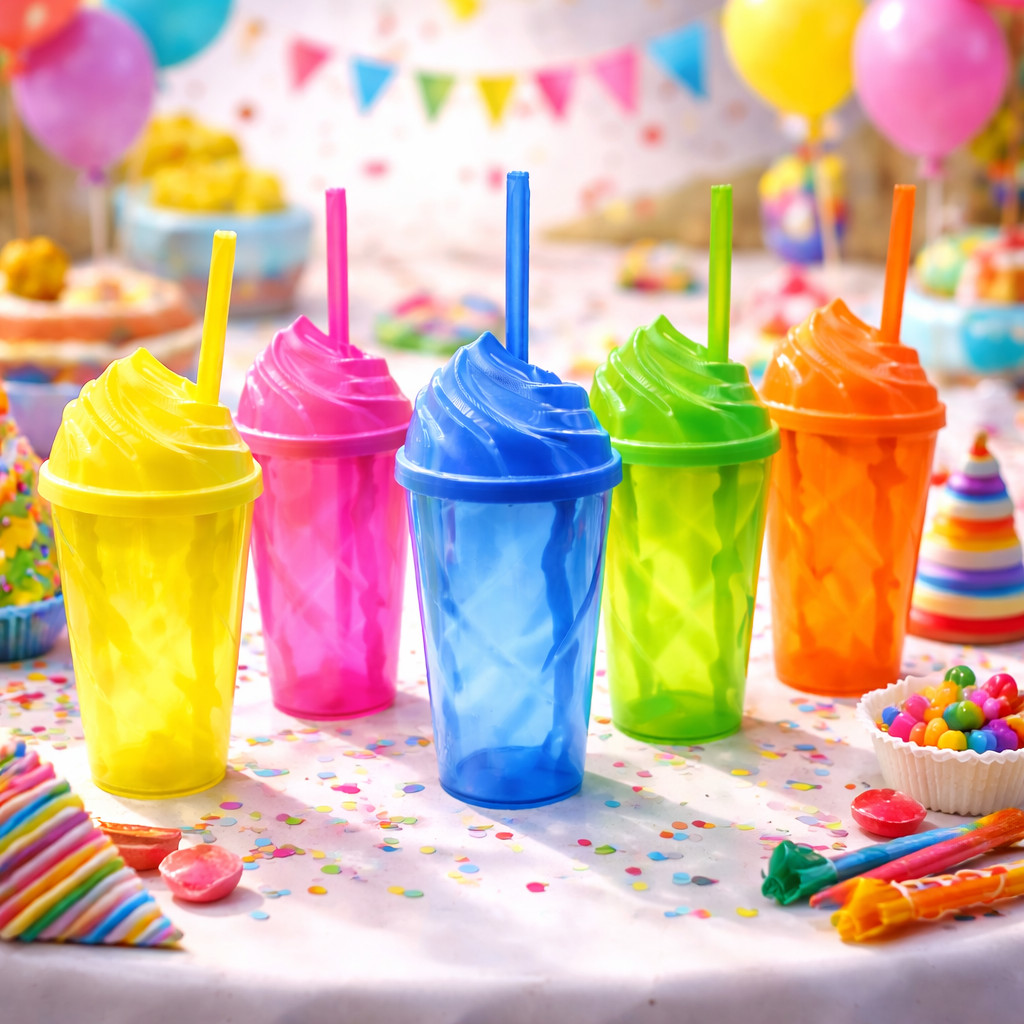 KIT 30 COPOS TWISTER 300ML COM TAMPA CHANTILLY E CANUDO NEON SORTIDO PARA FESTA ANIVERSÁRIO