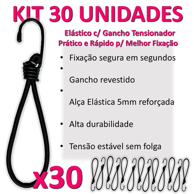 Kit 30 Elásticos 5mm Alça com Gancho Tensionador Prático Resistente Fixação Rápida