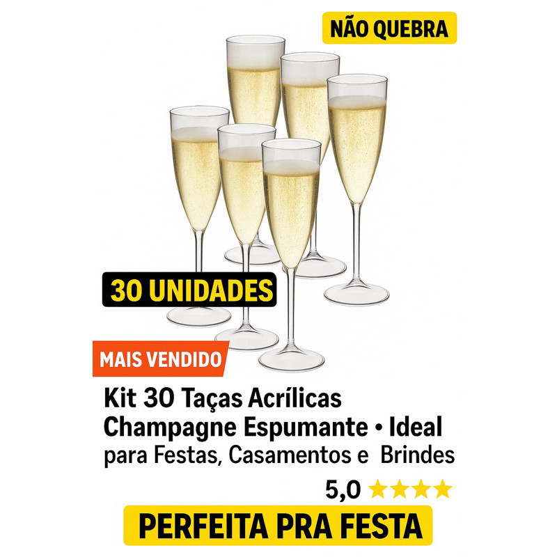 Kit 30 Taça de Champanhe Acrílica Espumante Champagne para Festas, Celebrações, Casamentos, Aniversários