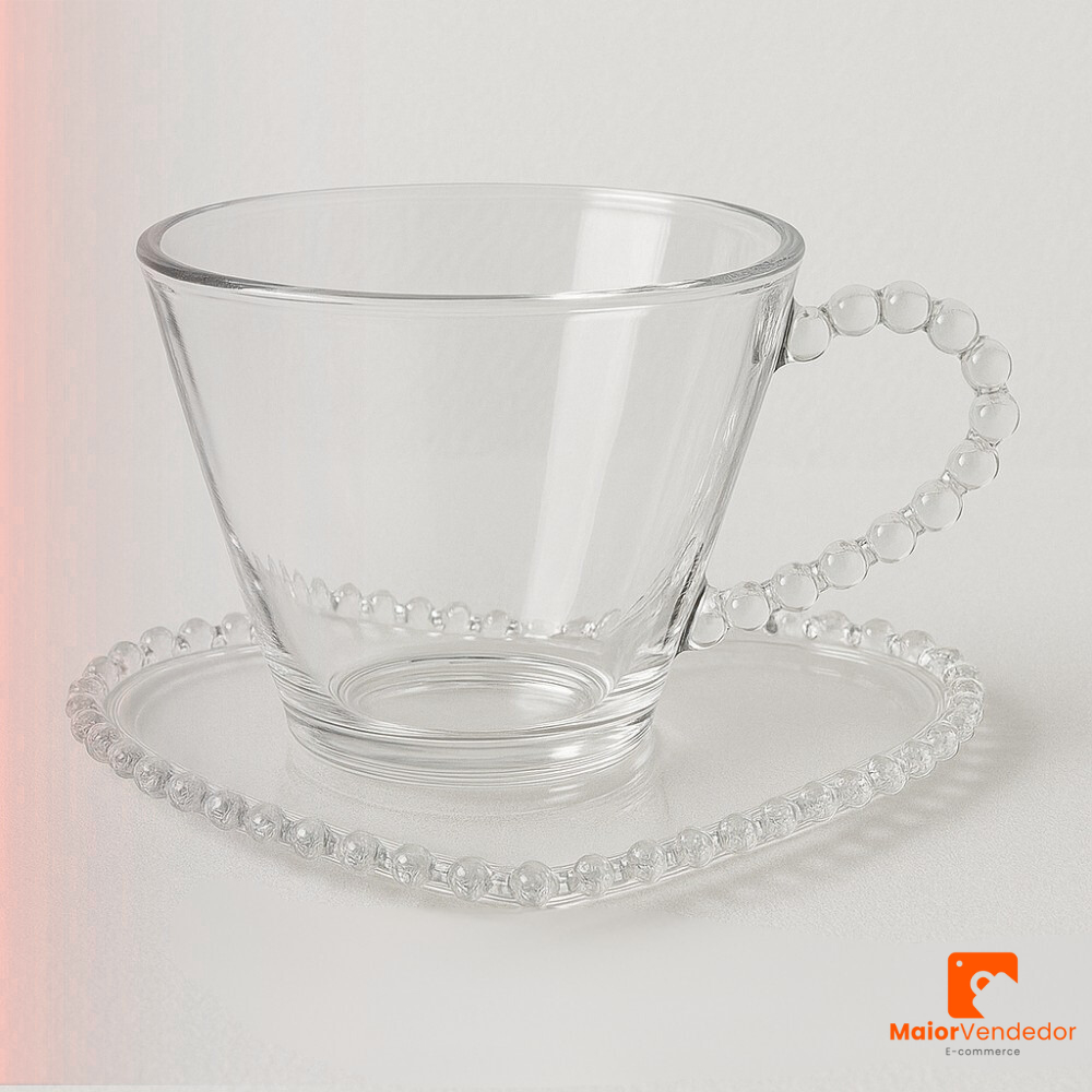 Kit 30 Xícaras + 30 Pires Coração 150ml Acrílico Transparente Pearl/Pérola Resistente Elegante