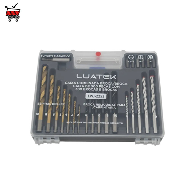 BROCAS MADEIRA METAL CONCRETO BUCHAS 5 6 8 10M BITS FENDA PHILLIPS TORX JOGO KIT 300 PCS C/MALETA LWJ-195 Garanta a versatilidade e eficiência que você precisa com o Jogo de Brocas e Buchas Cavilha Madeira Concreto Aço 300 Peças LWJ-195 da Luatek. Este kit completo é ideal para profissionais e amantes do "faça você mesmo", oferecendo uma solução prática para todas as suas necessidades de perfuração e fixação em diferentes materiais. Características: Ampla Variedade de Brocas: Inclui brocas específicas para madeira, concreto e metal, permitindo que você trabalhe com confiança em qualquer superfície. Acessórios Essenciais: Além das brocas, o kit vem com buchas de diferentes tamanhos e bits, tudo o que você precisa para realizar fixações seguras e precisas. Durabilidade e Desempenho: Fabricadas com materiais de alta qualidade, as brocas garantem resistência e longa vida útil, oferecendo excelente performance em cada uso. Fácil Armazenamento e Transporte: Organizado em uma maleta prática, o conjunto facilita o armazenamento e transporte, mantendo todas as peças ao seu alcance. Conteúdo da Embalagem: 5 Brocas para concreto: 4, 5, 6, 8 e 10 mm 7 Brocas para metal: 2, 3, 4, 5, 6, 8 e 10 mm 5 Brocas para madeira: 4, 5, 6, 8 e 10 mm 1 Adaptador magnético 2 Bits fenda 4 Bits Phillips Buchas de 5 mm, 6 mm, 8 mm e de 10 mm Esteja sempre preparado para enfrentar qualquer projeto com o Jogo de Brocas e Buchas Cavilha da Luatek, o kit completo que oferece praticidade, qualidade e eficiência para suas necessidades diárias!