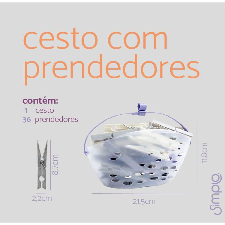 Conheça o Cesto com 36 prendedores de plástico multiuso da Simplo.Prático e resistente, é ótimo para organizar os prendedores, que servem para fixar roupas no varal e para fechar embalagens. Não danificam e não deixam marca nos tecidos e possuem alta durabilidade.São de PP e Aço. Evite a exposição constante do produto à luz solar.Leve funcionalidade e modernidade para sua casa!Pendure o gancho do cesto no varal e aperte para abrir os prendedores e fixar as peças. Ideal para ser utilizado na lavanderia com peças pequenas e médias.Também pode ser utilizado na dispensa para fechar embalagens.- Cesto com alça para pendurar no varal- Não danifica e não deixa marca nos tecidos- Alta durabilidade. É Simplo. Os prendedores são fabricados em polipropileno de alta durabilidade. A mola de aço garante a fixação ideal para prender as roupas no varal e as embalagens em segurança. O cesto é pendurável e organiza a lavanderia. A exposição constante á luz solar pode ressecar o plástico e diminuir sua durabilidade.Não pode:- Ser guardado sob a luz solar ou perto de fontes de calor.- Deixar ao alcance de crianças.