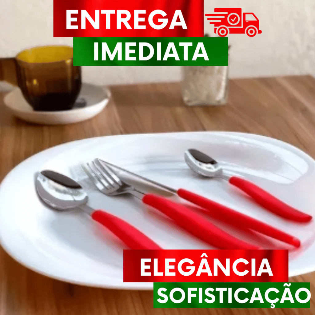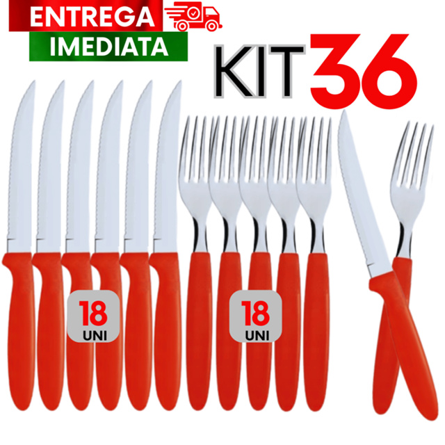 Kit 36 Utensílios de cozinha Inox 18 Garfos 18 Facas Premium Multiuso Linha Colorida Vermelho