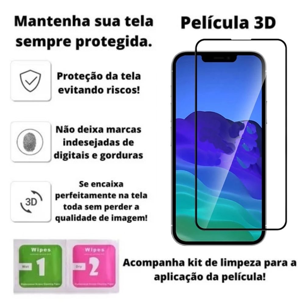 Ola, Seja bem-vindo (a) a Nossa Loja ! Kit 3em1 01 Capa Magsafe Transparente + 01 Pelicula de Vidro 3D + Pelicula Camera Compativel Com iPhone 11 Especificacoes: - Capa Magsafe transparente . Feita de uma combinacao de policarbonato transparente e materiais flexiveis na borda, ela se encaixa perfeitamente sobre os botoes, facilitando o uso. Um revestimento resistente a arranhoes foi aplicado a superficie, tanto na parte externa quanto na interna, e todos os materiais e coberturas sao tratados para nao amarelarem com o tempo. . As cases de acrilico sao referencia em qualidade com material reforcado que nao amarela, alem de contar com o sistema de magnetismo mais forte da categoria. . Com este case voce pode usar sem preocupacao as novas carteiras magneticas magsafe e o carregador sem fio magsafe com a maior absorcao do mercado. . Fina, leve e facil de segurar, esta capa criada oferece mais protecao sem esconder o brilho das cores do seu iPhone . Sofisticada e de altissima qualidade. . Facil de instalar e encaixe perfeito. . Protege seu iPhone. . Nao interfere na utilizacao de Pelicula - Pelicula 3D para Tela: . Facil aplicacao e encaixe perfeito. . Protege contra arranhoes e sujeiras. . Instalacao sem bolhas. . Cobre toda a tela. . Protege totalmente a tela do seu aparelho. . Nao interfere na utilizacao de capinha. . Nao interfere na sensibilidade do aparelho. . Produzido Com Gorilla Glass - Muito mais protecao do que as peliculas de vidro convencionais, pois e um vidro de alcali-aluminossilicato projetado para ser fino, leve e ultra resistente a danos. - Pelicula 3D para Camera: . Sofisticada e de Alta Qualidade. . A prova de Riscos e Arranhoes com Durabilidade mais Prolongada. . Protecao Completa da Camera: A tecnologia de Dureza 9H Protege a Camera sendo Resistente a Grandes Impactos. . Possui Design de Borda de Arco 3D. . Design Compacto e encaixe Perfeito. - Compativel Com iPhone 11 - Tela 6.1" Conteudo da Embalagem: . 01 - Capa anti impacto transparente . 01 - Pelicula de Vidro 3D para tela . 01 - Pelicula 3D para camera . 02 - Kit Limpeza para Aplicacao Aguardamos seu Pedido e Boas Compras!