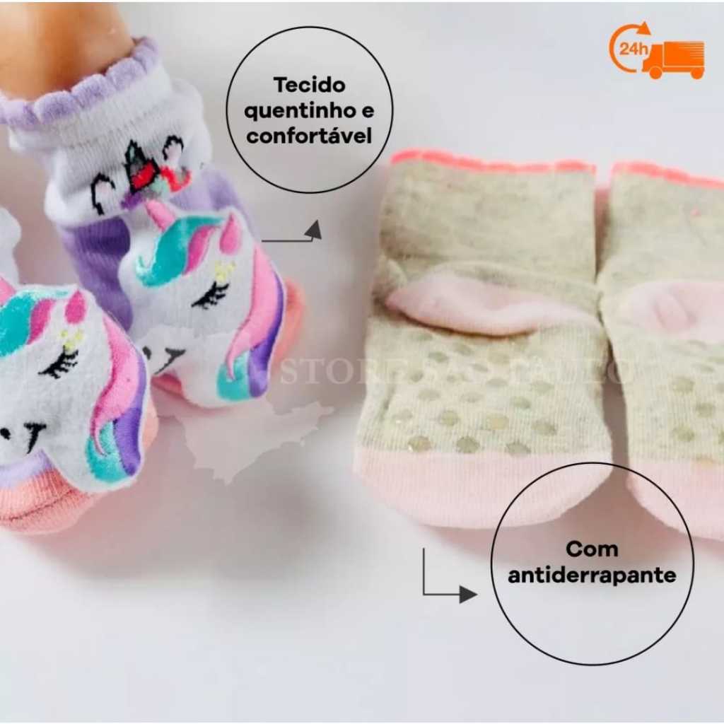 | Kit 3pares Meias Sapatinhos Pantufas com chocalho Infantil Bebe0-24... este produto | R$ 23,75 | 5% | 4.9/5 | — |