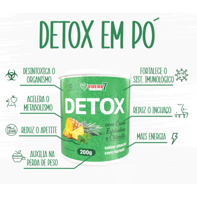 Sobre o produto: Kit com 3 Unidades É um excelente desintoxicante do organismo, além de auxiliar na disposição, dar mais energia, ser um grande aliado nas dietas de emagrecimento, melhorar o sistema imunológico e fornecer grande quantidade de fibras, vitaminas e minerais que estimulam o bom funcionamento do sistema digestivo. Recomendação de Uso: Adicione 10g (02 dosadores) a 200ml de água filtrada. Mexa até completa dissolução. Cuidados de Conservação: Durante o transporte e armazenamento, o produto pode compactar, portanto o volume corresponde ao peso líquido indicado. Após aberta a embalagem, manter o produto em lugar seco e arejado. Após aberta a embalagem, manter a tampa bem fechada para garantir as características do produto e recomenda-se o consumo em até 90 dias. Ingredientes: Maltodextrina, Espirulina, Chá verde em pó, Chlorella, Polpa de abacaxi, Guaraná em pó, Ácido ascórbico, Picolinato de cromo, Edulcorante sucralose, Antiumectante fosfato tricálcico INS 341iii, Acidulante ácido cítrico INS 330, Aroma de abacaxi com hortelã idêntico ao natural. NÃO CONTÉM GLÚTEN.