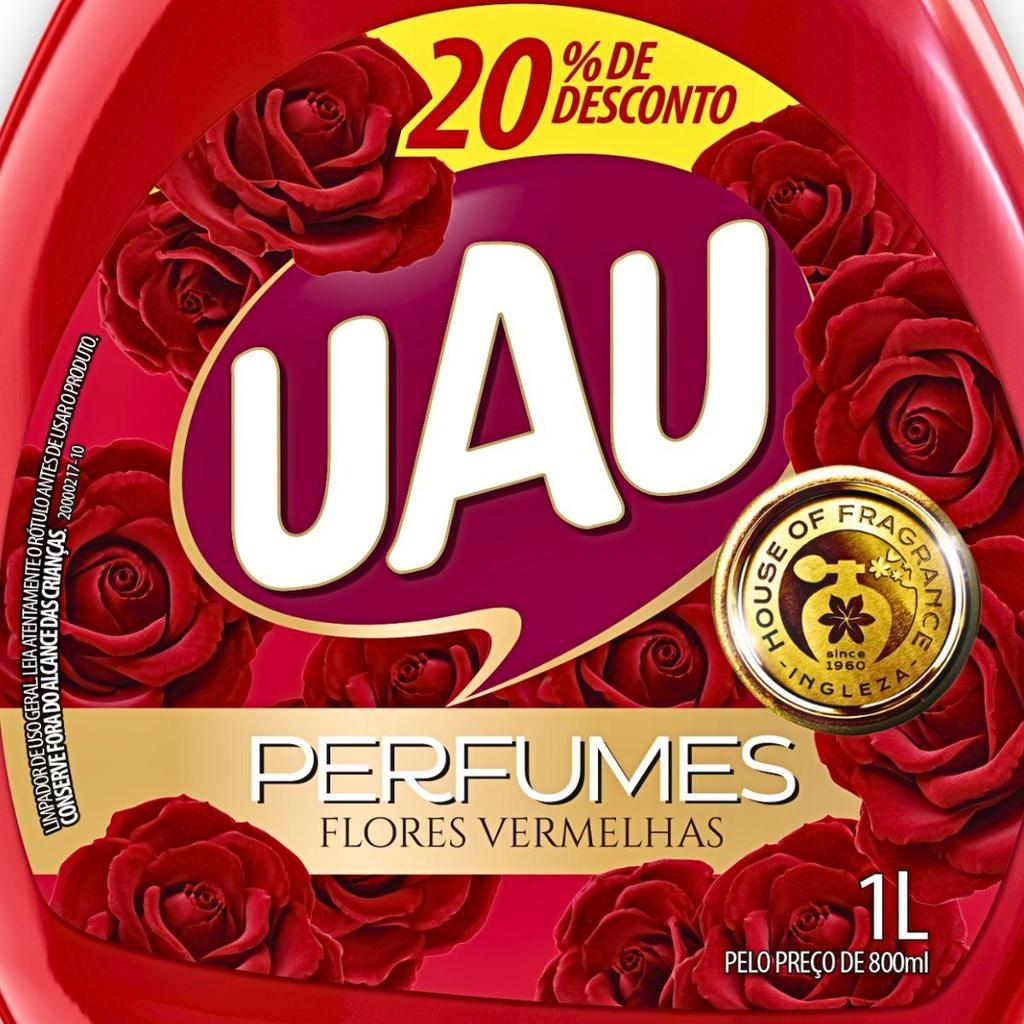 UAU LIMPADOR FLORES VERMELHAS E SEDUÇÃO - Contém 1 unidade de 1000 ml Limpador de uso geral com perfume prolongado e sensação de refrescância, conforto e bem-estar por até 15h Uau Perfumes é um limpador com fragrância inspirada em perfumaria fina internacional, que te salva na hora da correria ou quando você vai receber uma visita inesperada. Você quer deixar seus dias mais intensos com o fogo da paixão aceso? Então invista no aroma Flores Vermelhas & Sedução que incendeia o ambiente e os sentidos. Dilua 4 tampas em 5 litros de água, molhe o pano, torça e passe no piso lavável. Agora é só você curtir a sensação de dever cumprido! Dica: antes de usar, faça um teste em uma pequena área escondida para ter certeza que não mancha. UAU Perfumes é indicado para proporcionar o cheirinho de limpeza em superfícies laváveis, como pisos, azulejos, pias e bancadas da cozinha. Use também para dar aquele toque final ou fazer a manutenção da limpeza na sala, quarto, sala de jantar, lavanderia, área de churrasco e banheiro.