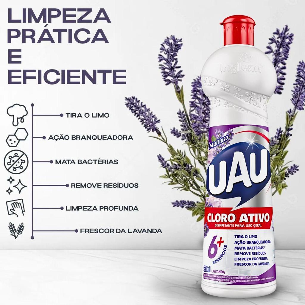 UAU Cloro Ativo Lavanda.Ação 5 em 1, com ele você limpa branqueia, desinfeta, remove o limo e ainda deixa um suave perfume de lavanda. Ele te ajuda a limpar as manchas de mofo e limo e também mata germes e bactérias.