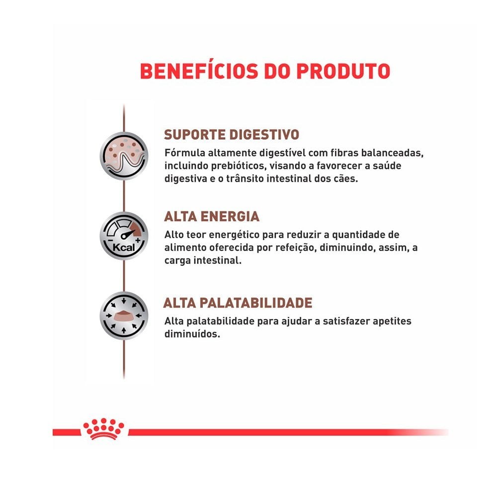 - Indicada para cães adultos; - Fórmula altamente digestível com fibras balanceadas visando favorecer a saúde digestiva dos cães; - Ajuda a reduzir a quantidade de alimento oferecida por refeição, diminuindo a carga de trabalho digestivo; - Alta palatabilidade para ajudar a satisfazer apetites diminuídos; A Ração Royal Canin Lata Canine Veterinary Diet Gastro Intestinal - 400 g é uma ração coadjuvante indicada para cães adultos com sensibilidades gastrointestinais. Esta fórmula de elevada digestibilidade com um equilibrado teor de fibra, contribui para uma digestão e trânsito intestinal saudáveis. Esta dieta contém um elevado teor energético para ajudar a reduzir o volume das refeições e diminuir a carga intestinal . Graças à sua fórmula altamente palatável, esta dieta é especialmente desenvolvida para encorajar a aceitação de alimentos em cães com um apetite reduzido. É importante que este produto seja dado ao seu animal de estimação apenas quando recomendado por um médico veterinário. Composição Água, carne de salmão, vísceras de aves, vísceras de suínos, quirera de arroz, celulose em pó, óleo de girassol, óleo de peixe refinado, carragena, parede celular de levedura (MOS), extrato de Marigold, tripolifosfato de sódio, cloreto de potássio, sulfato de cálcio, vitaminas (A, C, E, D3,B1, B2, B6, B12, PP), ácido pantotênico, ácido fólico, biotina, sulfato de cobre, iodato de cálcio, sulfato de zinco, sulfato de manganês, sulfato de ferro, cobre aminoácido quelato, zinco aminoácido quelato, manganês aminoácido quelato, taurina.