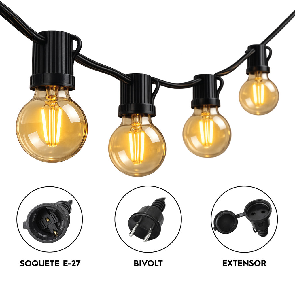 💡 KIT VARAL COMPLETO 10 SOQUETES E27 – 10 METROS (Sem Lâmpadas – Expansível) ⚠️ ALERTA IMPORTANTE: Este varal aceita apenas lâmpadas de até 12W por bocal para garantir segurança e evitar sobrecarga na fiação. ⚠️ ATENÇÃO - EXPANSÃO DOS CABOS: Ao conectar vários varais em série (extensão do cordão), a potência máxima suportada por lâmpada reduz proporcionalmente ao comprimento total. 📐 REGRAS PARA EXPANSÃO SEGURA: • 10 metros - 12W por bocal. • 20 metros - 6W por bocal. • 30 metros - 3W por bocal. ⚡ POR QUE ISSO ACONTECE? • Queda de tensão em longas distâncias • Limitação da fiação (bitola do cabo) • Segurança contra superaquecimento 📦 OPÇÕES DE KIT: ✔️ Kit 1 unidade: 1 Varal 10m com 10 soquetes E27 ✔️ Kit 2 unidades: 2 Varais 10m com 20 soquetes E27 ✔️ Kit 3 unidades: 3 Varais 10m com 30 soquetes E27 ⚙️ ESPECIFICAÇÕES TÉCNICAS (POR UNIDADE): • Comprimento Total: 10 metros • Quantidade de Soquetes: 10 (base E27 – rosca padrão) • Tensão: Bivolt Automático (100-240V) • Proteção: IP54 / IP65 (respingos e poeira – uso externo) • Material: PVC / plástico emborrachado 💡 APLICAÇÕES IDEAIS: ▸ Festas, casamentos e eventos ▸ Jardins, varandas, decks e piscinas ▸ Bares, restaurantes e áreas comerciais ▸ Iluminação decorativa residencial ✅ VANTAGENS: • Liberdade total para escolher lâmpadas (LED, incandescente, vintage, coloridas) • Instalação simples (conectar, fixar, iluminar) • Resistente à chuva (IP54/IP65)