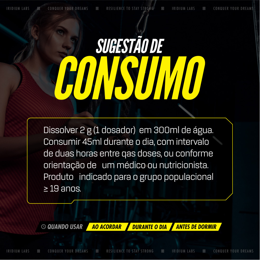 Kit 2x Beta Alanina - 120g Iridium Labs Características: 2g de Beta Alanina por Dose Não Contém Glúten Zero Açúcar Zero Sódio Ingredientes: Beta Alanina e antiumectante díóxido de silício "Este produto não deve ser consumido por gestantes, lactantes e crianças" deve constar na rotulagem do produto.