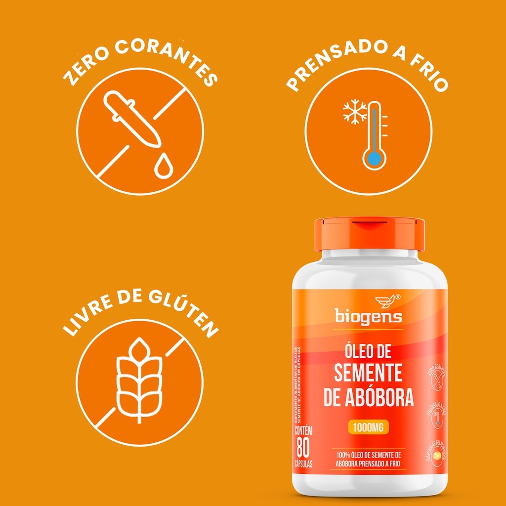 Os óleos vegetais (produtos extraídos das plantas) são de grande importância para a dieta humana. O óleo de semente de abóbora Biogens é fonte importante e alternativa de lipídeos, principalmente ácidos graxos. Como tem presença de gorduras insaturadas, ele auxilia o organismo em processos desinflamatórios. Um estudo coreano publicado em 2009 provou que homens que consumiram óleo de semente de abóbora tiveram uma redução dos sintomas de próstata aumentada depois de 6 meses e com isso conseguiram uma melhor qualidade de vida. Outro estudo, desta vez austriaco de 2016, concluiu que alguns componentes presentes no óleo de semente de abóbora podem reduzir os efeitos da DHT (hormônio que com o passar dos anos pode fazer a próstata aumentar de tamanho) INGREDIENTES: Óleo de Semente de Abóbora. Ingredientes da cápsula: água purificada, gelificante gelatina bovina INS 428 e umectante glicerina INS 422. NÃO CONTÉM GLÚTEN. ALÉRGICOS: PODE CONTER DERIVADOS DE PEIXE OU SOJA. SUGESTÃO DE USO: Tomar 4 cápsulas ao dia com água ou conforme recomendação profissional.