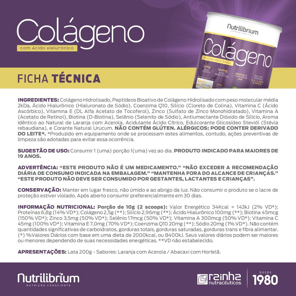 ESTE KIT POSSUI: - 1x Colágeno Verisol 200g Abacaxi com Hortelã Nutrilibrium - 1x Colágeno Thermo Lift 200g Laranja com Acerola Nutrilibrium - 1x Collagen Hialuron 90 Caps Nutrilibrium _____________________________________________________ COLÁGENO VERISOL INGREDIENTES: Colágeno Hidrolisado, Peptídeos Bioativo de Colágeno Hidrolisado com peso molecular média 2kDa®, Ácido Hialurônico (Hialuronato de Sódio), Vitamina C (Ácido Ascórbico), Coenzima Q10, Vitamina E (Acetato de DL-alfa-tocoferol), Zinco (Sulfato de Zinco Monoidratado), Silício (Ácido ortosilícico estabilizado em cloreto de colina), Vitamina A (Acetato de Retinol), Biotina (D-Biotina), Selênio (Selenito de Sódio), Aroma Sintético Idêntico ao Natural de Abacaxi com Hortelã, Acidulante Ácido Cítrico, Edulcorante Glicosídeos de esteviol (Stévia Rebaudina), Antiumectante e Corante Natural Clorofila. NÃO CONTÉM GLÚTEN. NÃO CONTÉM LACTOSE. ALÉRGICOS: PODE CONTER DERIVADOS DO LEITE E SOJA*. *Produzido em equipamento onde se processam estes alimentos, contudo, ações preventivas de limpeza são adotadas para evitar essa ocorrência. (ABACAXI COM HORTELÃ) MODO DE PREPARO: Sugere-se diluir 10g (aproximadamente 2 scoops) em 200mL (1 copo americano) de água ou bebida de sua preferência e mexa até completa dissolução. Pode ser consumido quente ou frio. Não utilize água fervendo. SUGESTÃO DE USO: Consumir 1 (uma) porção 1(uma) vez ao dia. PRODUTO INDICADO PARA MAIORES DE 19 ANOS. _____________________________________________________ COLÁGENO THERMO-LIFT® INGREDIENTES: Colágeno Hidrolisado, Peptídeos Bioativo de Colágeno Hidrolisado com peso molecular média de 2kDa®, Extrato de Laranja Moro (Citrus sinensis (L.) Osbeck), Cafeína Anidra, Ácido Hialurônico (Hialuronato de Sódio), Vitamina C (Ácido Ascórbico), Coenzima Q10, Vitamina E (Acetato de DL-alfa-tocoferol), Zinco (Sulfato de Zinco Monoidratado), Vitamina A (Acetato de Retinol), Biotina (D-Biotina), Selênio (Selenito de Sódio), Aromatizante Extrato Seco de Gengibre (Zingiber officinalis), Aroma Sintético Idêntico ao Natural de Guaraná com Açaí, Acidulante Ácido Cítrico, Edulcorante Glicosídeos de esteviol (Stévia Rebaudiana), Antiumectante e Corante Natural Carmin. NÃO CONTÉM GLÚTEN. NÃO CONTÉM LACTOSE. ALÉRGICOS: PODE CONTER DERIVADOS DO LEITE E SOJA*. *Produzido em equipamento onde se processam estes alimentos, contudo, ações preventivas de limpeza são adotadas para evitar essa ocorrência. (GUARANÁ COM AÇAÍ) MODO DE PREPARO: Sugere-se diluir 10g (aproximadamente 2 scoops) em 150mL (1 copo americano) de água ou bebida de sua preferência e mexa até completa dissolução. Pode ser consumido quente ou frio. Não utilize água fervendo. SUGESTÃO DE USO: Consumir 1 (uma) porção 1(uma) vez ao dia. PRODUTO INDICADO PARA MAIORES DE 19 ANOS. _____________________________________________________ COLLAGEN HIALURON INGREDIENTES: Peptídeos Bioativo de Colágeno Hidrolisado com peso molecular média 2kDa®, Ácido Hialurônico (Hialuronato de Sódio), Vitamina C (Ácido Ascórbico), Vitamina E (Acetato de DL-alfa-tocoferol), Zinco (Sulfato de Zinco Monoidratado), Vitamina A (Acetato de Retinol), Biotina (D-Biotina), Selênio (Selenito de Sódio) e Antiumectante Estearato de Magnésio. INGREDIENTES DA CÁPSULA: Gelatina, Água Purificada e Corante Dióxido de Titânio. NÃO CONTÉM GLÚTEN. SUGESTÃO DE USO: Consumir 3 (três) cápsulas 1(uma) vez ao dia. PRODUTO INDICADO PARA MAIORES DE 19 ANOS.