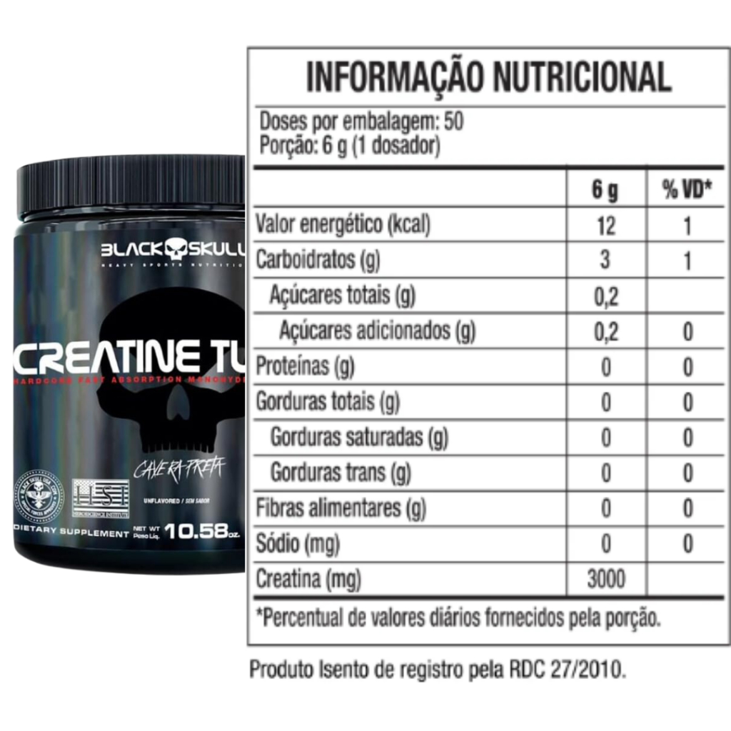 _ MODO DE CONSUMO: Adicionar 1 ¼ colher de chá (6g) do Creatine Turbo em 150ml de água e consumir uma vez ao dia ou conforme recomendação de um profissional da saúde. Importante que seu consumo esteja aliado a uma alimentação balanceada e a prática de exercício físico. Recomendação para adultos acima de 19 anos de idade. Consumir imediatamente após o preparo. Assim como os demais suplementos da BLACKSKULL USA™, recomendamos o armazenamento do produto em local seco, ao abrigo de luz e seu consumo em até 30 dias após a retirada do lacre interno. _ INGREDIENTES: Sem Sabor: creatina monohidratada e maltodextrina. CONTÉM LACTOSE. NÃO CONTÉM GLÚTEN.