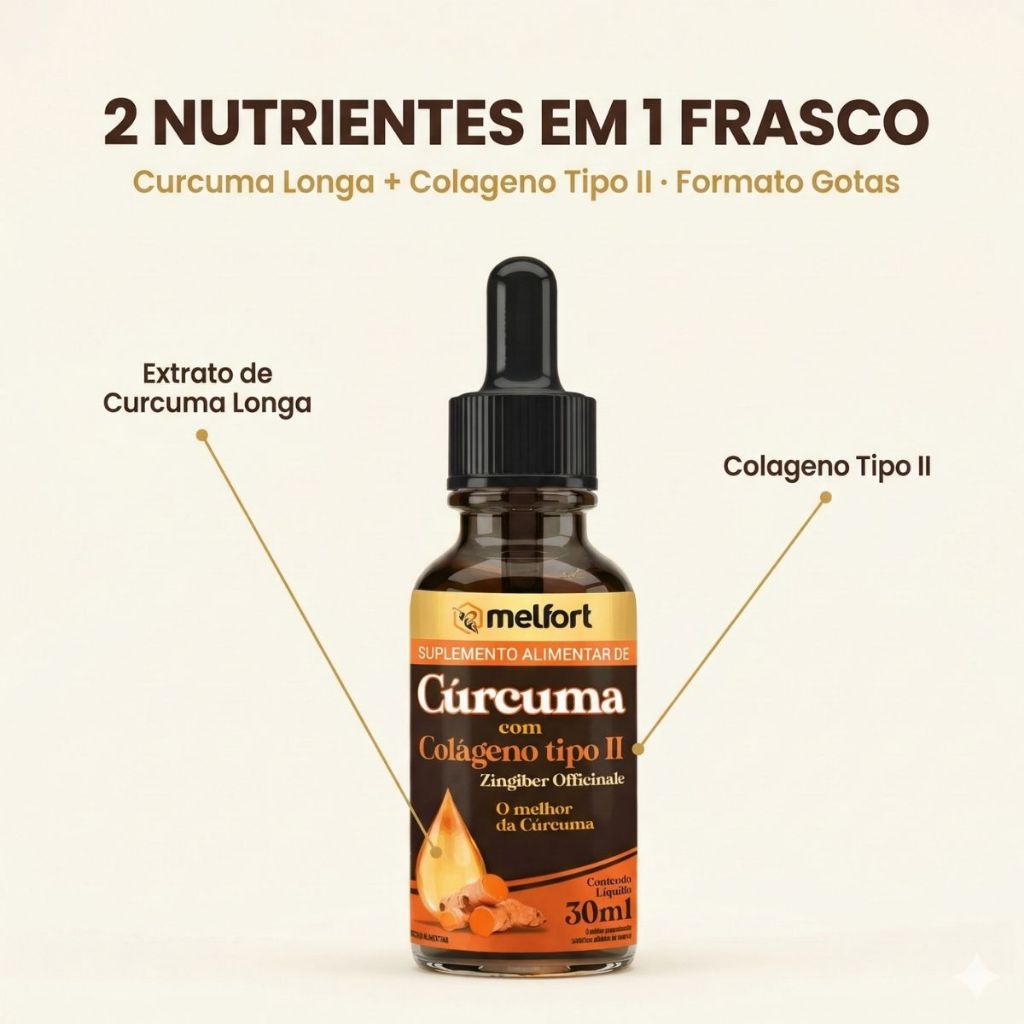 CÚRCUMA COM COLÁGENO TIPO II EM GOTAS — KIT COM 3 FRASCOS DE 30ml Cuidar de si deveria ser simples. Sem cápsulas difíceis de engolir, sem suplementos com gosto ruim, sem precisar comprar vários produtos separados. Se você já passou por isso, saiba que não está sozinha. Muitas pessoas querem incluir cúrcuma e colágeno tipo II na rotina, mas esbarram sempre nos mesmos problemas: cápsulas grandes demais, frascos que acabam rápido, fórmulas sem sabor que dão vontade de desistir. E no final, o suplemento fica esquecido na gaveta. Quem se dedica todos os dias merece um cuidado que seja tão simples quanto contar 20 gotas. Por isso a Melfort desenvolveu a Cúrcuma com Colágeno Tipo II em gotas. Uma fórmula líquida que combina extrato de cúrcuma longa e colágeno tipo II em um único frasco, com sabor natural de abacaxi e toque de gengibre. Prática, agradável e pensada para quem quer suplementar de verdade, sem complicação. E o melhor: este kit traz 3 frascos de 30ml, garantindo suplementação contínua na sua rotina diária. SEU PLANO DE SUPLEMENTAÇÃO EM 3 PASSOS Escolha seu kit com 3 frascos Tome 20 gotas por dia, puro ou com água, suco ou na refeição Faça da suplementação um hábito simples no seu dia a dia POR QUE ESCOLHER ESTE KIT Formato em gotas com conta-gotas: dosagem precisa e prática, sem engolir cápsulas Dois nutrientes em um só frasco: extrato de cúrcuma longa e colágeno tipo II juntos, sem precisar comprar separado Sabor agradável: aroma natural de abacaxi com gengibre, agradável a cada dose Kit com 3 frascos de 30ml: suplementação para sua rotina completa, sem interrupção Sem gluten e sem lactose: adequado para pessoas com sensibilidade ou intolerância Ingredientes naturais reconhecidos: cúrcuma longa e colágeno tipo II são nutrientes amplamente estudados e utilizados em suplementação INFORMAÇÃO NUTRICIONAL Porção de 1ml (aproximadamente 20 gotas) Curcumina: 5mg Colágeno Tipo II: 10mg MODO DE USO Ingerir 10 a 20 gotas ao dia, preferencialmente junto a uma refeição, ou conforme orientação de um médico ou nutricionista. Pode ser consumido puro ou diluído em água ou suco. Agitar antes de usar. CONSERVAÇÃO Conservar ao abrigo da luz, calor e umidade. Após aberto, manter a embalagem bem fechada e consumir em até 60 dias. Você não precisa de mais um suplemento esquecido na gaveta. Precisa de um hábito simples que cabe na sua rotina. Adicione ao carrinho e comece a cuidar de você hoje mesmo.