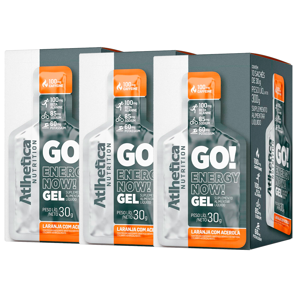 COMPOSIÇÃO DO ANÚNCIO: 03 Go! Energy Now! Gel Display - Atlhetica Nutrition "GO! ENERGY NOW! GEL Mudar os hábitos e começar a praticar atividade física, qualquer que seja o seu objetivo, exige muita disciplina, energia mental e corporal. Nosso corpo é uma máquina com aprendizado rápido e dinâmico. Com rotinas cada vez mais estressantes e um dia a dia mais corrido, é comum que o cansaço seja predominante e você não tenha estímulos para a prática de exercícios físicos. A cafeína é um fitoquímico com ação estimulante, pode aumentar o estado de alerta, de concentração, além de ser uma substância natural que pode ser encontrada no café, guaraná, chá-verde e no cacau, por exemplo. Sua principal característica é a ação no sistema nervoso central, servindo como estimulante e contribuindo para o aumento do foco, raciocínio e desempenho esportivo, segundo pesquisas realizadas por cientistas em todo o mundo. Além de estimular a rotina de atividades físicas, recompor o organismo é uma das tarefas fundamentais e principais antes, durante e depois de qualquer exercício. Grande parte líquida do organismo é perdida no suor e, com ele, também se vai um importante nutriente: o sódio. Perder esse mineral em grandes quantidades pode significar desidratação, por isso é imprescindível o processo de recomposição. Inclusive, outro importante mineral essencial para quem pratica atividades físicas constantemente é o potássio. Participante do funcionamento das células, nervos e ossos, o potássio favorece o equilíbrio do pH no sangue, além de controlar a pressão arterial. Fundamental para os tecidos musculares, é peça importante na formação de suas fibras. INGREDIENTES: • AÇAÍ COM GUARANÁ: FORMULA GO! ENERGY NOW GEL [Maltodextrina, Palatinose™ (Isomaltulose), Cafeína, Beta-Alanina, Cloreto de Sódio, Citrato de Sódio, Óxido de Magnésio, Cloreto de Potássio], Água Purificada, Água de Coco, Acidulante Ácido Cítrico, Regulador de Acidez Ácido Fosfórico, Aromatizantes, Conservadores Sorbato de Potássio, Benzoato de Sódio e EDTA Dissódico, Corantes Artificiais Bordeaux S, Azul Brilhante FCF e Azul Indigotina, Edulcorante Sucralose. “NÃO CONTÉM GLÚTEN.” ALÉRGICOS: PODE CONTER DERIVADOS DE SOJA. • LARANJA COM ACEROLA: FORMULA GO! ENERGY NOW GEL [Maltodextrina, Palatinose (Isomaltulose), Cafeína, Beta-Alanina, Cloreto de Sódio, Citrato de Sódio, Óxido de Magnésio, Cloreto de Potássio], Água Purificada, Água de Coco, Acidulante Ácido Cítrico, Regulador de Acidez Ácido Fosfórico, Aromatizantes, Conservadores Sorbato de Potássio, Benzoato de Sódio e EDTA Dissódico, Corante Artificial Amarelo Crepúsculo FCF e Edulcorante Sucralose. "NÃO CONTÉM GLÚTEN." "ALÉRGICOS: PODE CONTER DERIVADOS DE SOJA." • MORANGO COM LIMÃO: FORMULA GO! ENERGY NOW GEL [Maltodextrina, Palatinose (Isomaltulose), Cafeína, Beta-Alanina, Cloreto de Sódio, Citrato de Sódio, Óxido de Magnésio, Cloreto de Potássio], Água Purificada, Água de Coco, Acidulante Ácido Cítrico, Regulador de Acidez Ácido Fosfórico, Aromatizantes, Conservadores Sorbato de Potássio, Benzoato de Sódio e EDTA Dissódico, Corante Artificial Vermelho 40 e Edulcorante Sucralose. "NÃO CONTÉM GLÚTEN." "ALÉRGICOS: PODE CONTER DERIVADOS DE SOJA." RECOMENDAÇÃO DE USO: Consumir 30g (1 sachê) com água, antes ou durante o exercício. Recomendado para indivíduos saudáveis a partir de 19 anos. • 15 minutos antes da atividade, • Durante, a cada 45 minutos. CONSERVAÇÃO: Conservar o produto em local fresco, seco e livre de raios solares. Consumir imediatamente após a abertura. IMPORTANTE: "ESTE PRODUTO NÃO É MEDICAMENTO." "NÃO EXCEDER A RECOMENDAÇÃO DIÁRIA DE CONSUMO INDICADA NA EMBALAGEM." "MANTENHA FORA DO ALCANCE DE CRIANÇAS." "ESTE PRODUTO NÃO SER CONSUMIDO POR GESTANTES, LACTANTES E CRIANÇAS." "PODE CAUSAR PARESTESIA, EM DOSES INDIVIDUAIS SUPERIORES A **300MG." **BETA ALANINA. IMAGEM MERMANETE ILUSTRATIVA TABELA PODE VARIAR CONFORME SABOR
