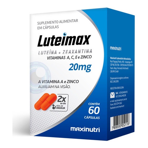 Kit 3 caixas de Luteimax Luteína & Zeaxantina + Vitaminas A, C, E e Zinco 60cps Maxinutri Ingredientes: Luteína, zeaxantina, vitamina A, vitamina C, vitamina E, zinco, excipiente: silicato de magnésio, antiumectante: dióxido de silício, cápsula: gelatina e corantes: dióxido de titânio, amarelo 6 e vermelho 40. Não contém glúten. Sugestão de uso: Ingerir 2 cápsulas ao dia, de preferência com as refeições. Conservação: Conservar ao abrigo da luz, calor e umidade. Após aberto consumir em até 60 dias. Rendimento 30 porções. "Produto dispensado de registro conforme RDC 240/2018."