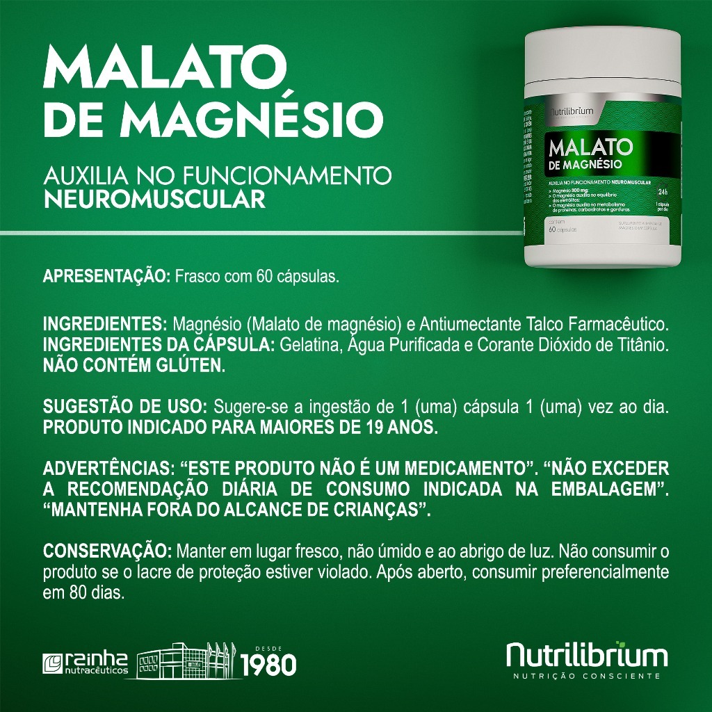 MALATO DE MAGNÉSIO INGREDIENTES: Magnésio (Malato de Magnésio) e Antiumectante Talco Farmacêutico. INGREDIENTES DA CÁPSULA: Gelatina, Água purificada e Corante Dióxido de Titânio. NÃO CONTÉM GLÚTEN. SUGESTÃO DE USO: Sugere-se a ingestão de 1 (uma) cápsula 1 (uma) vez ao dia. PRODUTO INDICADO PARA MAIORES DE 19 ANOS. ADVERTÊNCIAS: “ESTE PRODUTO NÃO É UM MEDICAMENTO.” “NÃO EXCEDER A RECOMENDAÇÃO DIÁRIA DE CONSUMO INDICADA NA EMBALAGEM.” “MANTENHA FORA DO ALCANCE DE CRIANÇAS.” CONSERVAÇÃO: Manter em lugar fresco, não úmido e ao abrigo da luz. Não consumir o produto se o lacre de proteção estiver violado. Após aberto, consumir preferencialmente em 60 dias.
