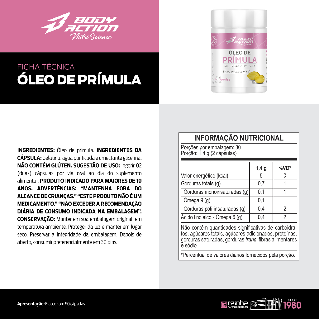 ÓLEO DE PRÍMULA INGREDIENTES: Óleo de prímula. INGREDIENTES DA CÁPSULA: Gelatina, água purificada e umectante glicerina. NÃO CONTÉM GLÚTEN. SUGESTÃO DE USO: Ingerir 02 (duas) cápsulas por via oral ao dia do suplemento alimentar. PRODUTO INDICADO PARA MAIORES DE 19 ANOS. ADVERTÊNCIAS: "MANTENHA FORA DO ALCANCE DE CRIANÇAS." *ESTE PRODUTO NÃO É UM MEDICAMENTO.' "NÃO EXCEDER A RECOMENDAÇÃO DIÁRIA DE CONSUMO INDICADA NA EMBALAGEM". CONSERVAÇÃO: Manter em sua embalagem original, em temperatura ambiente. Proteger da luz e manter em lugar seco. Preservar a integridade da embalagem. Depois de aberto, consumir preferencialmente em 30 dias.