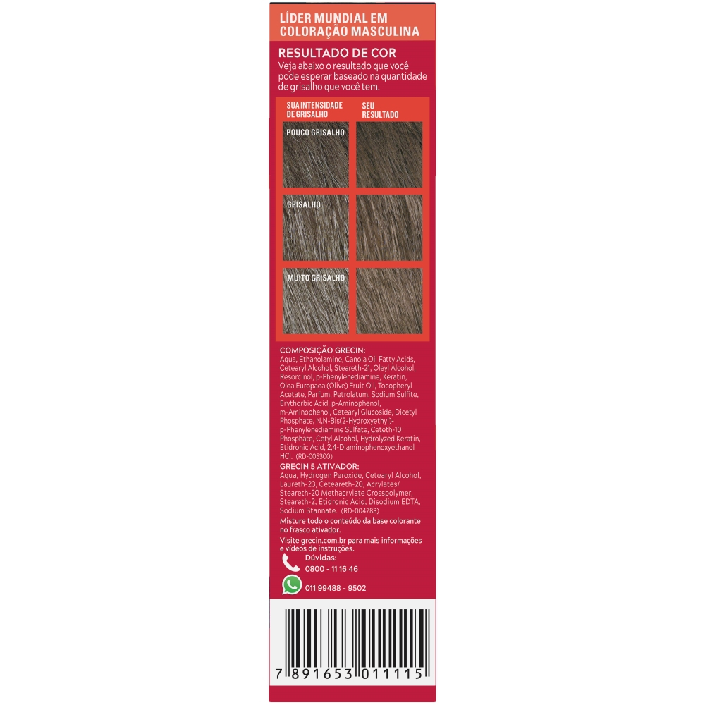 "Grecin 5 Shampoo tonalizante cobre todo o grisalho em 5 minutos. para uma aparência natural. - Fácil e rápido: Elimina os grisalhos em 5 minutos. - Fórmula patenteada, combina com a cor original do cabelo para resultados com aparência natural. - O resultado é duradouro, basta reaplicar quando os fios grisalhos crescerem novamente. - Sem amônia, é suave com os cabelos, deixando-os com uma aparência mais volumosa e sem grisalhos. - Nova fórmula com Queratina, Azeite de Oliva e Vitamina E. Aparência jovem e natural. Simples assim. IMPORTANTE: Sempre leia e siga as instruções de uso do folheto incluso. *Lembre-se de realizar o teste de alergia 48h antes de usar" Aplique. Espere 5 min. Lave com shampoo e enxague.