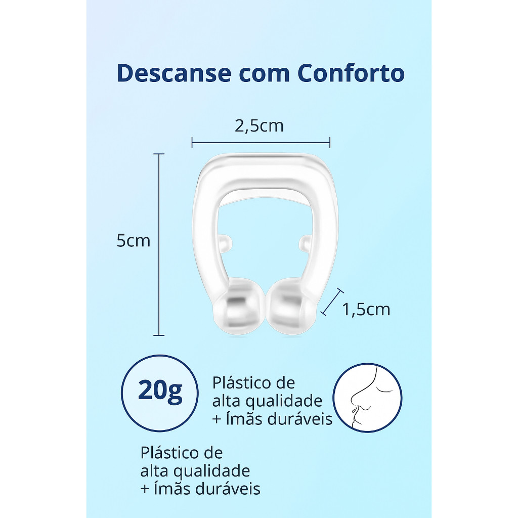**Clip Nasal Magnético Ajuda a Eliminar o Ronco e Melhorar a Qualidade do Sono** O clipe nasal magnético é a escolha ideal para uma noite tranquila e reparadora. Este produto inovador foi projetado para aliviar eficazmente o ronco e a apneia do sono, desobstruindo as vias aéreas e permitindo que você respire com mais facilidade e por mais tempo. Seu design ergonômico e discreto garante conforto durante o sono, proporcionando uma noite de sono tranquila para você e sua família. **Especificações Técnicas:** - Material: Plástico de alta qualidade e ímãs duráveis - Tamanho: 5 cm x 2,5 cm x 1,5 cm - Peso: 20 gramas - Cor: Transparente - Uso: Clipe nasal magnético - Função: Ajuda a reduzir o ronco e a apneia do sono - Fácil de limpar: Lavável e reutilizável Diga adeus ao ronco e desfrute de um sono mais profundo e reparador, com melhor qualidade de sono todas as noites. Acorde revigorado todas as manhãs!