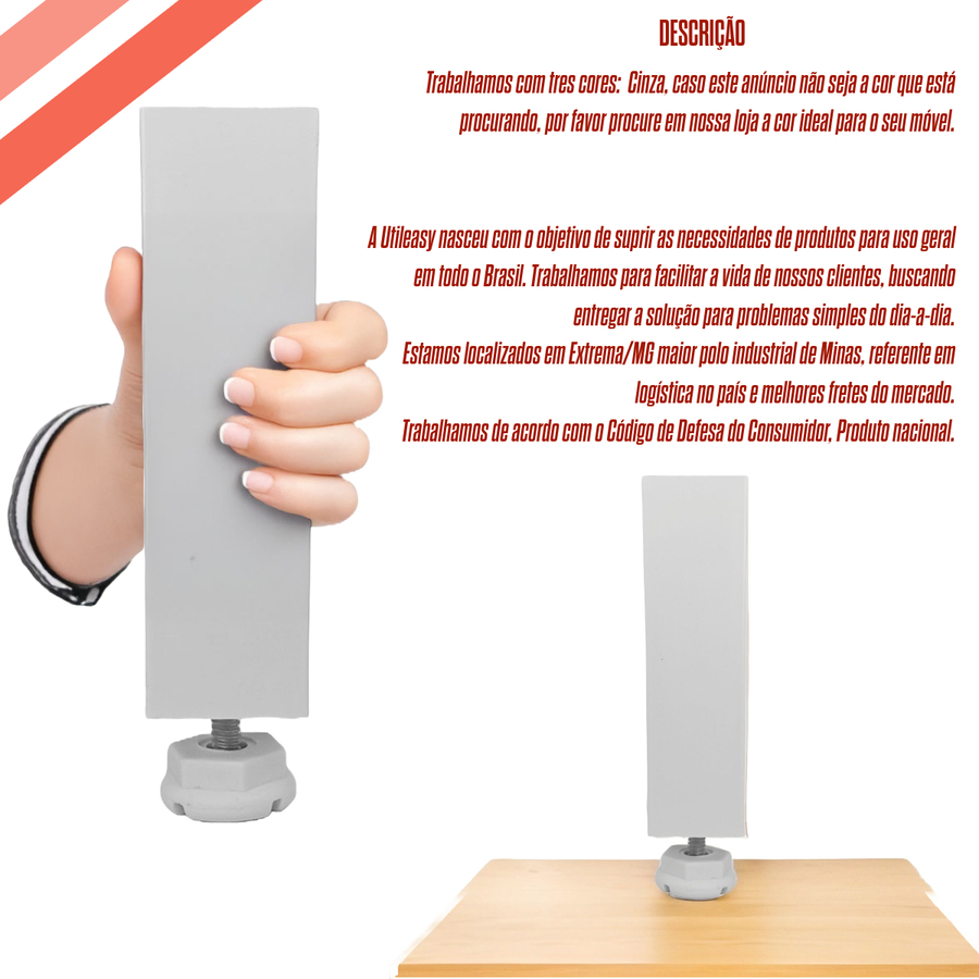 KIT 4/6/8/10/12 Pé Cantoneira Regulável Quadrado 130x35x35mm Branco Móveis de Cozinha Rack Estantes Roupeiro Guarda Roupas Armário Descrição do Produto: O Pé Cantoneira Preto com Altura Regulável é perfeito para quem busca uma solução prática e resistente para nivelamento e suporte. Com um design moderno e estrutura robusta, este produto é ideal para móveis, estantes ou estruturas que necessitam de ajustes precisos e confiáveis. Características do Produto: Altura Ajustável *Altura mínima: 127 mm *Altura máxima: 136 mm *Ajuste simples para atender às suas necessidades de nivelamento. Dimensões da Base: *Base superior: 35 mm x 35 mm *Espessura da base metálica: 3 mm *Furação central com diâmetro de 4 mm, permitindo fixação segura. Material: *Produzido em plástico de alta durabilidade e reforço metálico na base, oferecendo resistência ao desgaste e maior vida útil. *Formato prático que facilita a instalação e o ajuste. Nota: Esses artigos não acompanham pregos ou parafusos. Dica: Antes da instalação, confira as dimensões e compatibilidades para melhor performance do produto. Entre na nossa loja e explore os acessórios para a sua casa, na Utileasy, sua primeira linha de materiais para móveis e acessórios! *Se você precisar de uma quantidade diferente do anuncio, nos informe via campo de perguntas a quantidade exata que deseja, que nós fazemos um anuncio exclusivo para você. *Veja nossas qualificações *Conheça nossos produtos (Temos outros modelos de Rodizio, conheça já) *Tire suas dúvidas no campo de perguntas *Enviamos para todo o Brasil! NOSSA EMPRESA A Utileasy nasceu com o objetivo de suprir as necessidades de produtos para uso geral em todo o Brasil. Trabalhamos para facilitar a vida de nossos clientes, buscando entregar a solução para problemas simples do dia-a-dia. Produto nacional Estamos localizados em Extrema/MG maior polo industrial de Minas, referente em logística no país e melhores fretes do mercado; Trabalhamos de acordo com o Código de Defesa do Consumidor; POLÍTICA DE TROCA Recebendo a Mercadoria Verifique a mercadoria assim que recebê-la, antes de assinar. Em caso de avaria, produto incorreto ou outros problemas, o destinatário tem o direito de recusar a mercadoria sem custo. *Já recebeu e viu algum defeito? Todos os produtos tem garantia contra defeitos de fabricação. Então fique tranquilo caso tenha algum produto com defeito, iremos fazer a troca assim que recebermos a solicitação. SERVIÇO DE ATENDIMENTO AO CLIENTE Postagem: As mercadorias serão postadas para pedidos até as 14 horas Satisfação Garantida Melhor Custo Benefício Conte com uma equipe especializada para atender a todas as suas dúvidas 24 horas/dia, 7 dias/semana. Garantia do vendedor: 1 mês