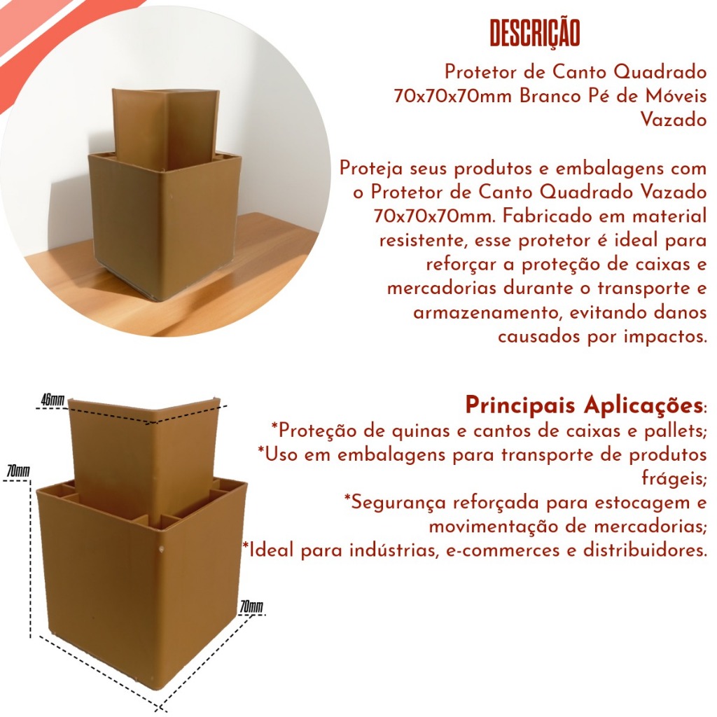 Pé Quadrado Vazado 70x70x70mm – Alta Proteção e Resistência O Protetor de Canto Quadrado Vazado 70x70x70mm é a solução ideal para proteger quinas e cantos de caixas, embalagens e mercadorias durante o transporte, armazenagem e movimentação. Fabricado em material plástico resistente, ele absorve impactos e evita danos causados por batidas, quedas ou atritos. Seu formato vazado proporciona encaixe firme, maior resistência estrutural e distribuição eficiente da pressão nos cantos, garantindo mais segurança para produtos frágeis e embalagens de maior valor. Principais Vantagens ✔ Protege quinas e cantos contra impactos ✔ Reduz avarias durante transporte e estocagem ✔ Estrutura resistente e reutilizável ✔ Encaixe preciso em cantos quadrados ✔ Ideal para logística, e-commerce e indústria Aplicações Proteção de caixas e embalagens Pallets e mercadorias empilhadas Transporte de produtos frágeis Armazenamento e movimentação logística Uso industrial, comercial e e-commerce Especificações Técnicas Modelo: Protetor de Canto Quadrado Vazado Dimensões: 70 x 70 x 70 mm Espessura: Aproximadamente 4 mm Material: Plástico resistente