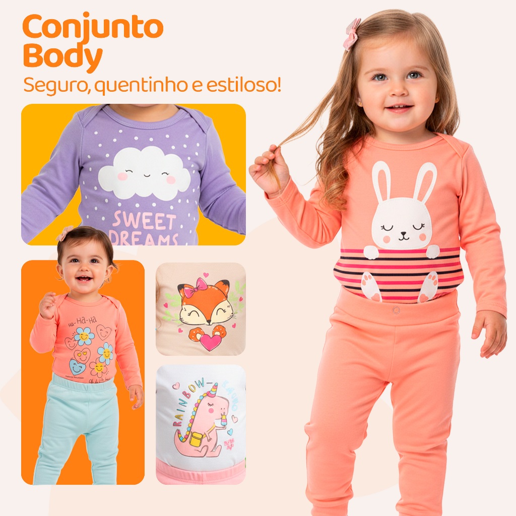 Body Longo feminino 👧 Kit Body Longo + Calça Mijão Bebê Menina – 100% Algodão | Escolha Kit com 2 ou 4 Conjuntos Praticidade e fofura em cada detalhe para o dia a dia da sua bebê! ✅ O que acompanha: Você escolhe entre três opções de kit: - Kit com 2 conjunto: 2 body manga longa + 2 calça mijão - Kit com 4 conjuntos: 4 bodies manga longa + 4 calças mijão 🧵 Características do Produto: - Confeccionado em 100% algodão – leve, macio e ideal para a pele delicada do bebê • Gola transpassada – facilita o vestir e evita desconfortos • Punho na barra da calça – garante melhor ajuste e segurança • Cores delicadas e estampas encantadoras – selecionadas com carinho • Modelagem confortável, com ótimo caimento 📏 Tabela de Medidas: BODY • Tamanho P – Busto: 20 | Comprimento: 37 | Manga: 21 | Veste: 1 a 3 meses • Tamanho M – Busto: 23 | Comprimento: 38 | Manga: 23 | Veste: 3 a 6 meses • Tamanho G – Busto: 24 | Comprimento: 40 | Manga: 24 | Veste: 6 a 9 meses CALÇA • Tamanho P – Cintura: 16 | Comprimento: 37 | Veste: 1 a 3 meses • Tamanho M – Cintura: 17 | Comprimento: 39 | Veste: 3 a 6 meses • Tamanho G – Cintura: 18 | Comprimento: 41 | Veste: 6 a 9 meses As medidas podem ter variação de até 2 cm ℹ️ Informações Importantes: - As cores e estampas são sortidas e enviadas conforme disponibilidade • Não é possível escolher modelos específicos • Compras de mais de um kit no mesmo tamanho podem ter repetição de estampa ou cor Produto disponível para envio imediato – pedidos feitos até as 13h são enviados no mesmo dia útil
