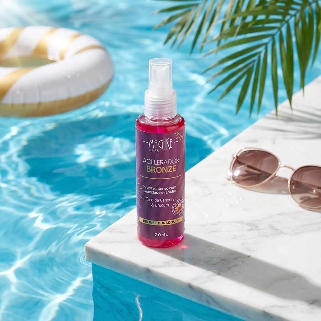 Acelerador de Bronze Magike Beauty 120ml – Urucum e Cenoura Conquiste um bronzeado mais rápido, intenso e uniforme com o Acelerador de Bronze Magike Beauty. Desenvolvido com extrato de urucum e cenoura, ativos naturais ricos em betacaroteno, ele potencializa o bronze dourado enquanto cuida da sua pele. Sua fórmula possui textura leve, fácil de espalhar e rápida absorção, deixando a pele hidratada, macia e com aparência saudável durante e após a exposição ao sol. Benefícios: ️ Acelera o bronzeado natural ️ Intensifica o tom dourado da pele ️ Com extrato de urucum e cenoura ️ Ajuda a manter a pele hidratada e nutrida ️ Textura leve e não oleosa ️ Ideal para praia, piscina ou câmara de bronzeamento Modo de Uso: Aplique uma quantidade suficiente sobre a pele limpa e seca antes da exposição ao sol. Reaplique conforme desejar para intensificar o bronzeado. ️ Atenção: Este produto não substitui o uso de protetor solar. Informações do Produto: Marca: Magike Beauty Conteúdo: 120 ml Indicação: Todos os tipos de pele Categoria: Acelerador de Bronze / Bronzeador Corporal Magike Beauty – Seu bronze com mais intensidade, cuidado e beleza.