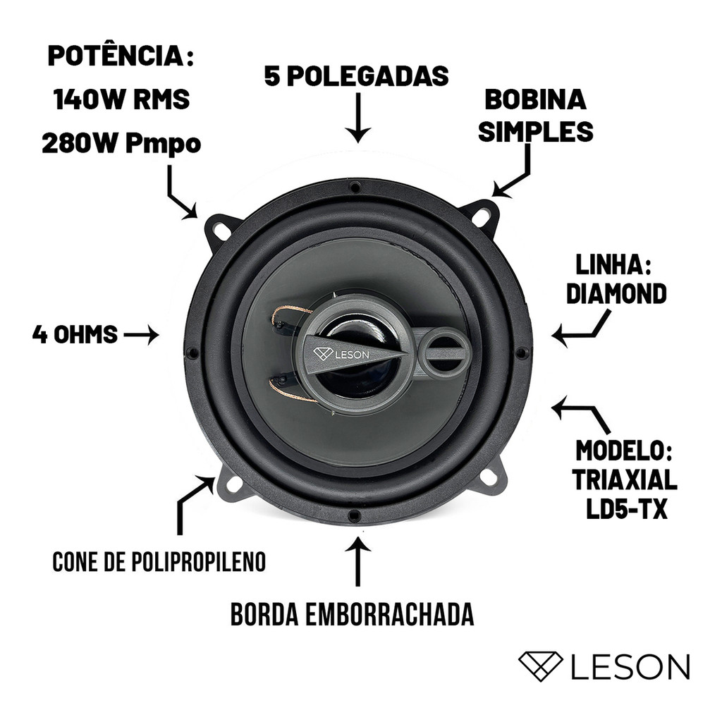 Potência e clareza em todas as portas do seu carro! Com o Kit 4 Alto-Falantes 5” Triaxial Leson LD5-TX, você eleva a qualidade do som automotivo com equilíbrio, definição e excelente custo-benefício. Ideal para quem deseja substituir os alto-falantes originais ou montar um sistema mais potente, este conjunto oferece graves presentes, médios bem definidos e agudos cristalinos, garantindo uma experiência sonora completa e envolvente. O LD5-TX une design moderno com materiais de alta durabilidade, como cone em polipropileno e borda emborrachada, além de encaixe universal, que facilita a instalação em diversos modelos de veículos. Características: 4 alto-falantes triaxiais de 5” (2 pares) Potência sonora total de 280W RMS / 560W PMPO Som limpo e equilibrado em todas as frequências Cone em polipropileno e borda emborrachada Design moderno que valoriza o interior do carro Instalação simples e compatível com vários veículos Especificações técnicas (por par): Potência: 280W PMPO / 140W RMS Impedância: 4 Ohms Sensibilidade: 87 dB Frequência de resposta: 60Hz a 20.000Hz Tweeter: Piezo Cone: Polipropileno Borda: Emborrachada Diâmetro: 5 polegadas Conteúdo da embalagem: 4 alto-falantes Leson LD5-TX (2 pares)