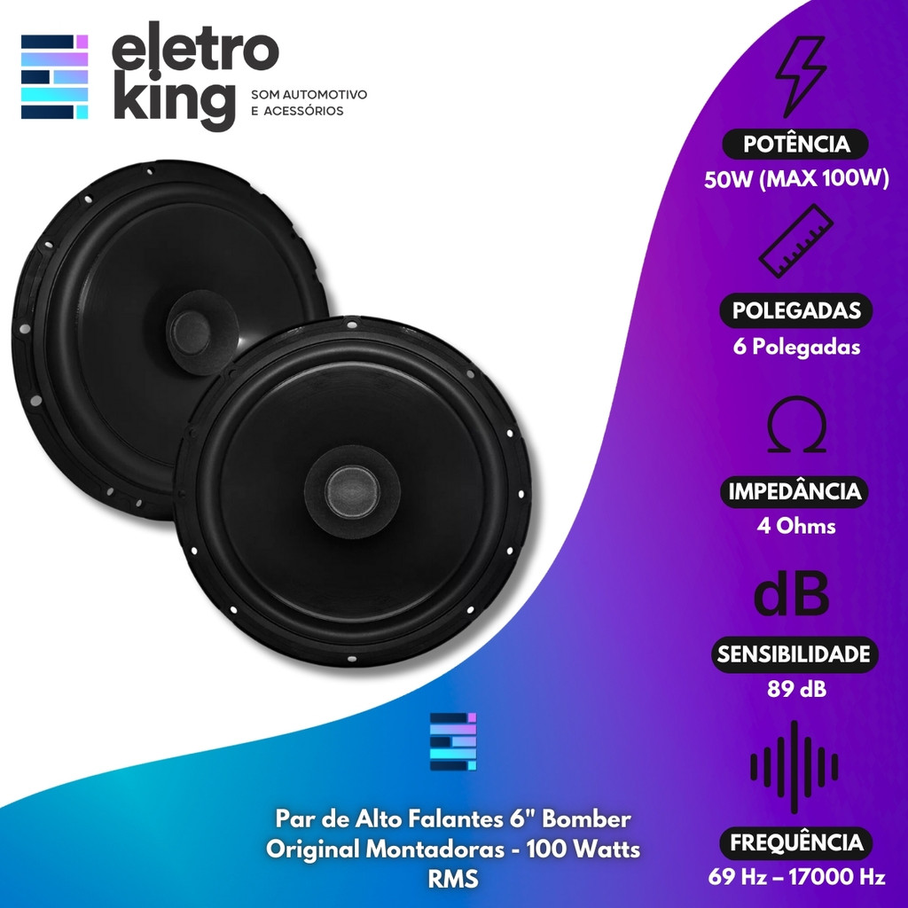 Seja bem-vindo a Eletroking, leia atentamente a descrição do produto abaixo antes da compra, qualquer dúvida, nos acione no campo de perguntas do anúncio. Kit 4 Alto Falantes Coaxiais 6 Bomber Montadoras 200W + Par Alto Falantes 4 Bomber 120W Kit 4 Alto Falantes Coaxiais 6 Bomber Montadoras 200W + Par Alto Falantes 4 Bomber 120W – um conjunto completo de alta performance para som automotivo. Esse kit inclui 4 alto-falantes de 6 da linha Bomber Montadoras, com potência de 200W (100W RMS cada), ideais para médios e graves potentes e equilibrados. Também acompanha um par de alto-falantes BBR TOP de 4 com 120W RMS, proporcionando som detalhado e envolvente nos médios e agudos, graças ao cone de polipropileno e conjunto magnético de 60 mm. Com impedância de 4 Ohms e sensibilidade de 86 dB SPL, esse kit é perfeito para uma experiência sonora imersiva e de fácil instalação em diversos veículos. Especificações Técnicas: Par de Alto Falantes 6 Bomber Original Montadoras - 100 Watts RMS • Modelo: BBR6 • Tamanho: 6 • Potência (RMS): 50 W RMS (unitário) • Impedância: 4 Ohms • Sensibilidade: 89 dB SPL • Material do Cone: IMPP Par de Alto Falantes 4 Bomber Triaxial BBR Top - 120 Watts RMS • Modelo: BBRT4-60 • Linha: BBR • Tamanho: 4 • Potência (RMS): 60 W RMS (Unit) 120W RMS (Par) • Impedância nominal: 4 Ohms • Resposta em frequência: (-10 dB) 126 Hz - 20 kHz • Sensibilidade (Banda efetiva): 86 dB SPL • Material da carcaça: Polipropileno Conteúdo da Embalagem: • 02 Pares de Alto Falantes 6 Bomber Original Montadoras • 01 Par de Alto Falantes 4 Bomber Triaxial BBR Top • 01 Par Tweeter • 01 Par Divisor de Frequência • Chicote • Manual de Garantia Importante: • Garantia de 273 Dias. • Valor Do Kit. • Todos os Nossos Produtos São Novos, Originais e Acompanham Nota Fiscal. • A Eletroking recomenda que a instalação seja feita por profissional especializado e não se responsabiliza pelo mau uso do produto.