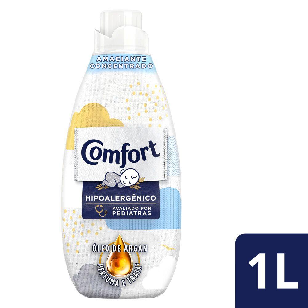 Kit 4 Amaciantes Concentrado Comfort Puro Cuidado 1L - O Amaciante Concentrado Comfort tem óleo de argan em sua fórmula! - Perfume suave com extrato de aveia. - Amaciante dermatologicamente testado. - Amaciante recomendado para peles delicadas, seguro para usar nas roupas de bebê. - Conforto tem ótimo rendimento, menos de meia tampinha basta! - Conforto evita formação de bolinhas e o desbotamento das núcleos. O Amaciante Concentrado Comfort Puro Cuidado tem perfume suave com extrato de aveia e faz como roupas durarem muito mais! Sua nova fórmula contém óleo de argan (um óleo natural com alto potencial nutritivo) que previne os danos da lavagem, mantendo como cores do tecido vibrantes por mais tempo e como roupas perfumadas. Menos de meia tampinha de Comfort concentrado basta para lavar suas roupas. Sua fórmula além de ser hipoalergênica é dermatologicamente testada por pediatras, dermatologistas e outros profissionais da saúde. Dessa forma, O Amaciante Concentrado Comfort Puro Cuidado é indicado para ser usado em roupas de bebês e de pessoas com peles sensíveis e delicadas. Sua fórmula contém extrato de aveia que penetra profundamente nas fibras do tecido durante a lavagem, deixando-as com uma maciez irresistível, toque gentil e com todo cuidado que as peles sensíveis merecem. - Kit Contém: 4 Amaciantes Concentrado Comfort Puro Cuidado 1L cada - Compre Produtos Comfort.