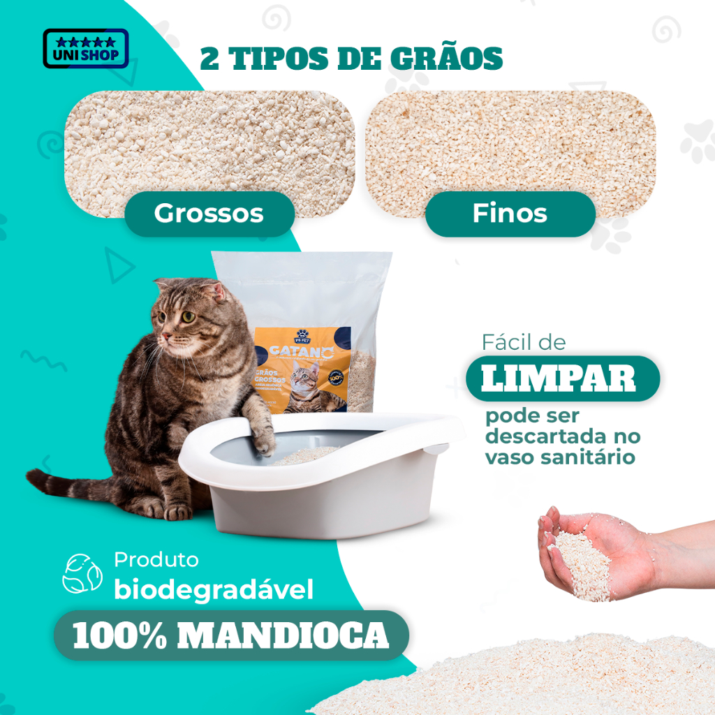 Areia Higiênica Biodegradável Gatano — 100% Mandioca | Grãos Finos E Grossos | 4kg / 16kg Natural, eficaz e amiga do planeta. A Gatano Biodegradável 100% Mandioca é a escolha perfeita para quem ama seu gato e se preocupa com o meio ambiente. Desenvolvida com ingredientes orgânicos de origem vegetal, nossa fórmula exclusiva à base de mandioca oferece um desempenho superior em absorção, controle de odores e praticidade na rotina. _____ Vantagens que fazem a diferença: • Biodegradável e 100% Orgânica: Feita exclusivamente de mandioca, a Gatano se decompõe naturalmente, sem agredir o meio ambiente. Um produto sustentável que une amor aos animais e responsabilidade ecológica. • Ultra Aglutinante: Forma torrões firmes e secos em segundos, facilitando a remoção e mantendo a bandeja sempre limpa. • Controle Natural de Odores: Neutraliza cheiros desagradáveis sem aditivos químicos. Mais conforto para o seu gato, mais frescor para sua casa. • Grãos Finos: Grãos cuidadosamente calibrados para maior rendimento, conforto nas patinhas e menor desperdício. • Livre de Pó: Não contém pó, protegendo as vias respiratórias do seu gato e de toda a família. Ideal para ambientes fechados. • Flushable — Pode Ser Descartada no Vaso: A Gatano dissolve na água, permitindo o descarte prático e higiênico diretamente no vaso sanitário. _____ • Para quem é a Gatano? Para tutores exigentes que buscam o equilíbrio perfeito entre desempenho, sustentabilidade e bem-estar animal. Ideal para gatos filhotes, adultos e idosos, inclusive os mais sensíveis. • Modo de Uso: 1. Preencha a bandeja com cerca de 5 cm de Gatano. 2. Retire os torrões diariamente. 3. Complete com areia nova conforme necessário. 4. Troque totalmente após 25 a 30 dias ou quando necessário. Volume Unitário Por Pacote: 4kg Volume total do Kit: 16kg Composição: Fécula de mandioca e ingredientes naturais. Validade: Indeterminada quando armazenada corretamente. Gatano. Naturalmente melhor. O cuidado que seu gato merece, com a pureza que a natureza oferece. Selecione o tipo do grão: FINOS ou GROSSOS!