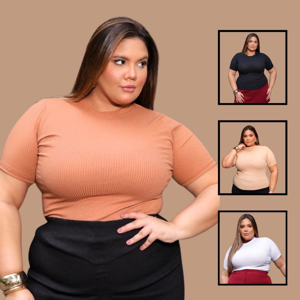 Kit 4 Blusas Plus Size Feminina Gola Alta Caneladinho Premium Estilosa Malha Elegante Basica Casual