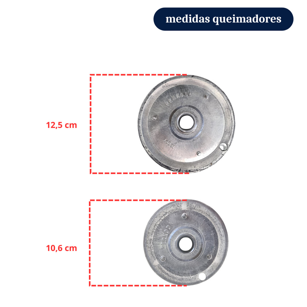 kit contem: - 3 ESPALHADORES PEQUENO - 6,5 CM DIÂMETRO - 3 QUEIMADORES (SORVETE ) - 8,7 CM DIÂMETRO (altura do cano 4,5 cm) - 1 ESPALHADORES GRANDE - 7,5 CM DIÂMETRO - 1 QUEIMADORES (SORVETE ) - 10 CM DIÂMETRO (altura do cano 4,5 cm) para fogões Continental e Consul SERVE NO MEU FOGÃO? Compare A FOTO do anuncio com a peça que esta em seu fogão. Essa é Única maneira de saber se você esta comprando o produto correto, pois o mesmo modelo de fogão pode ter peças com encaixes diferentes. *produto reforçado para melhor durabilidade* *preste atenção se a peça que procura corresponde com as do anúncio* *caso tenha duvidas o campo de perguntas estará disponível para cessa-las* ----------------------------------- - Embalagens em perfeitas condições para transporte - Serviço de Qualidade - Enviamos em até 24 horas após confirmação do pagamento - Peças de qualidade direto da fabrica - A mais de 10 anos no mercado - Atendimento com técnicos profissionais treinados caso o modelo do seu fogão seja outro basta nos informar no campo (perguntas) para enviarmos o link do produto correto. Sem garantia