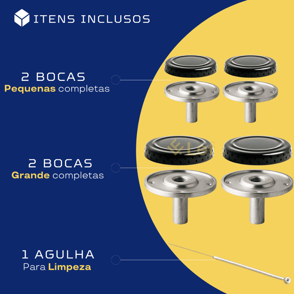 Kit com 4 bocas para fogão Atlas – ideal para reposição e economia de gás! Inclui peças DE ALTA QUALIDADE, com encaixe perfeito nos modelos mais populares da Atlas. Serve nos modelos: Mônaco / Mônaco Glass / Mônaco Plus Coliseum Plus / Coliseum Glass Havana / Grécia / Tropical (Não serve no Tropical Inox ou Plus) O que vem no kit: • 2 tampinhas pequenas (6,5 cm) • 2 tampinhas grandes (7,5 cm) • 2 queimadores pequenos tipo sorvete (7,0 cm) • 2 queimadores grandes tipo sorvete (8,0 cm) Dica: sempre confira as medidas e fotos antes da compra para garantir que é o modelo certo para seu fogão! Produto novo, pronto para deixar seu fogão como novo!