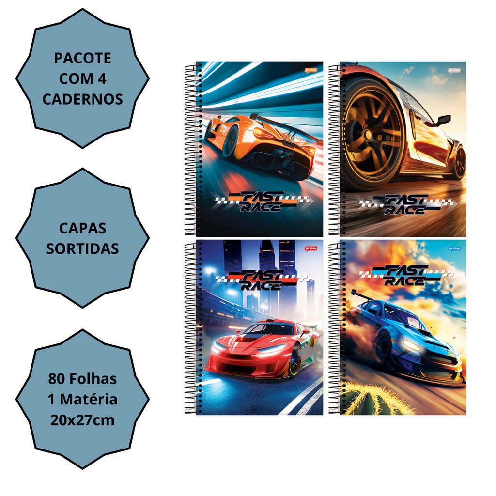 Kit 4 Cadernos Universitário Fast Race Capa Dura 1 Matéria 80 Folhas 20x27cm - Jandaia