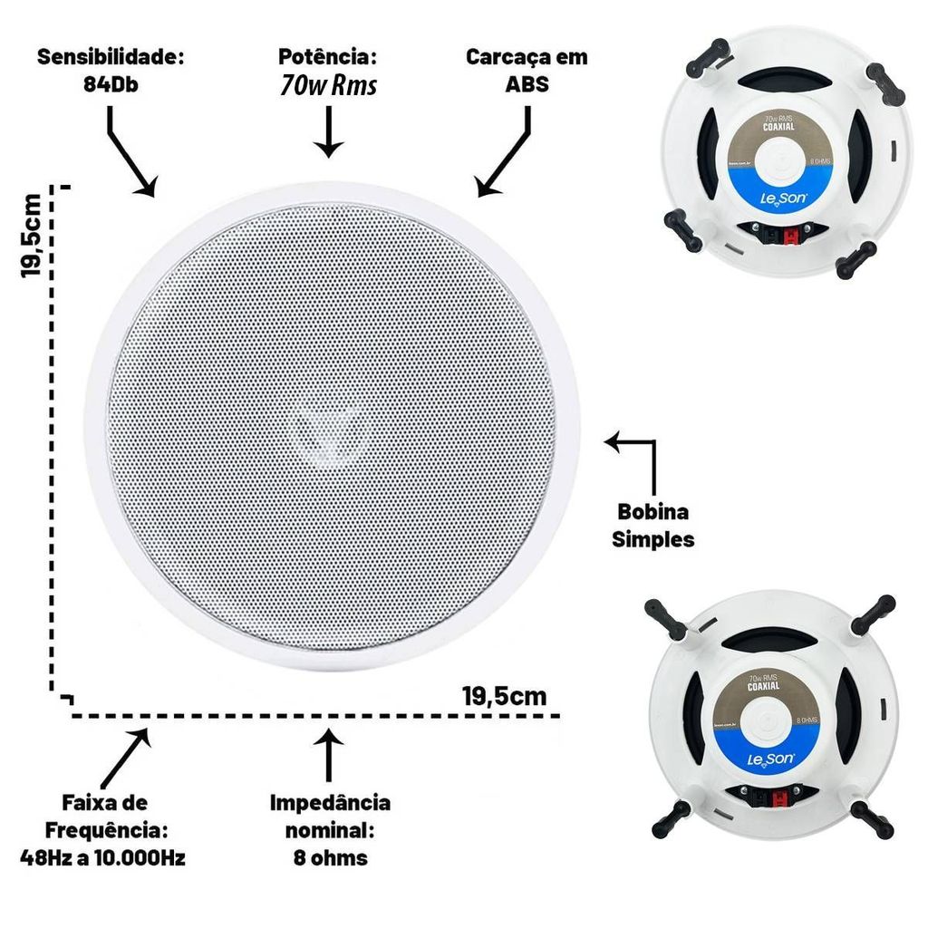 Arandela Caixa Som Ambiente Bluetooth Ativa 140W Embutir Gesso Redonda Kit com 2LSREDBR + 2LS20078B CARACTERÍSTICAS • Comando por voz • Conexão inteligente sem fio via bluetooth • Compatível com Amazon Alexa e Google Assistant • 140W Rms | 08 Ohms | Coaxial • A arandela Bluetooth é feita com materiais de qualidade e resistentes, garantindo completa satisfação a seus compradores. • Controle de som por Bluetooth • Produto inovador, levando praticidade para preencher qualquer ambiente com suas músicas prediletas! • Conta com uma arandela ativa de 70W Rms e uma passiva, podendo ser instalada em forro de drywall, gesso, madeira e etc possui garras para fixação ajustáveis. ESPECIFICAÇÕES ARANDELA ATIVA • Alto Falante: 6 polegadas • Tweeter coaxial com piezo duplo • Potência Nominal: 70W Rms • Faixa de Frequência: 100 - 20kHz • Impedância: 8 Ohms • Alto falante mid bass com borda de espuma • Dimensões: 6x19,5x19,5 cm • Cor: Branca ESPECIFICAÇÕES ARANDELA PASSIVA • Alto Falante: 6 polegadas • Potência Nominal: 70W Rms • Tweeter coaxial com piezo duplo • Faixa de Frequência: 100 - 20kHz • Impedância: 8 Ohms • Dimensões: 6x19,5x19,5 cm • Cor: Branca ITENS INCLUSOS • 1 Alto Falante coaxial de embutir ativo bluetooth • 3 Alto Falante coaxial de embutir passivo • 1 Fonte de alimentação 12V - 5 AMP / Bivolt 110V - 220V • Suportes de fixação • Manual