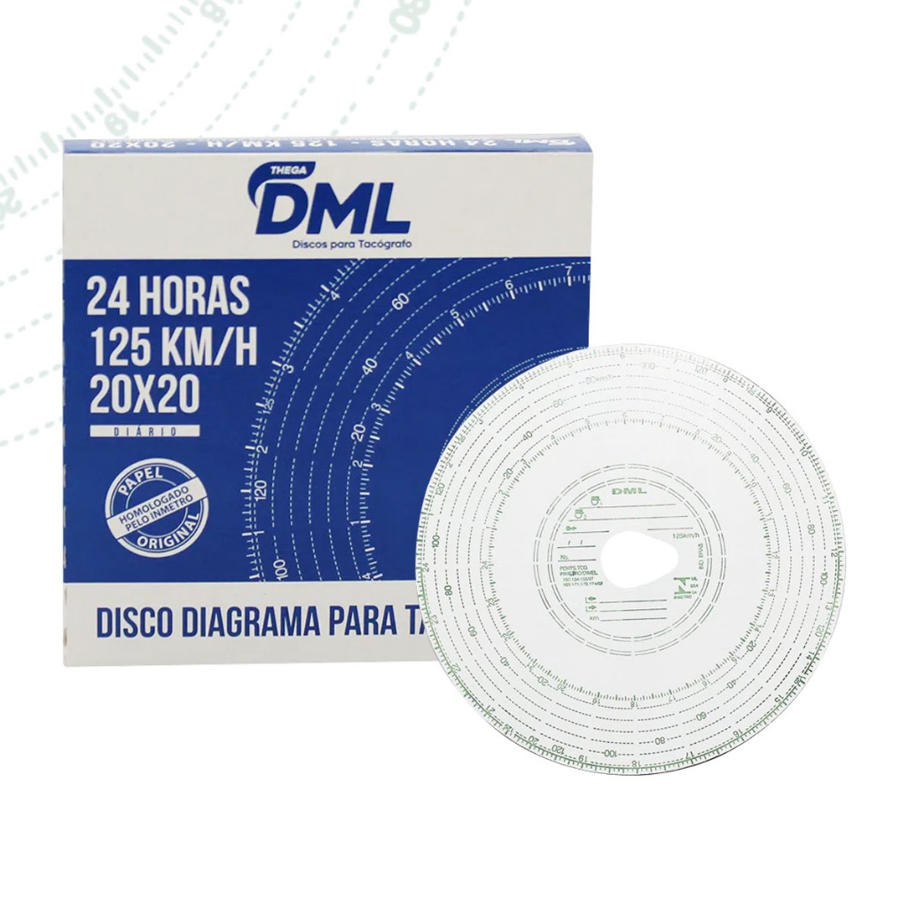 DISCO TACÓGRAFO DIÁRIO 24H/125KM 20X20 - DML Os Discos Diagramas para Tacógrafos DML são responsáveis pelo registro da velocidade, distância percorrida e tempo de movimentação do veículo, com um armazenamento altamente confiável, uma vez que impossibilita a alteração dos dados registrados. Sua utilização é obrigatória para: ✅ Veículos de transporte ✅ Condução de escolares ou de passageiros com mais de dez lugares ✅ Veículos de carga com capacidade máxima de tração superior a 19 T ou com peso bruto total superior a 4.536 kg, quando produzidos a partir de 1º de janeiro de 1999. A manipulação e a alteração dos dados registrados são impossíveis, o que garante qualidade e confiabilidade;
